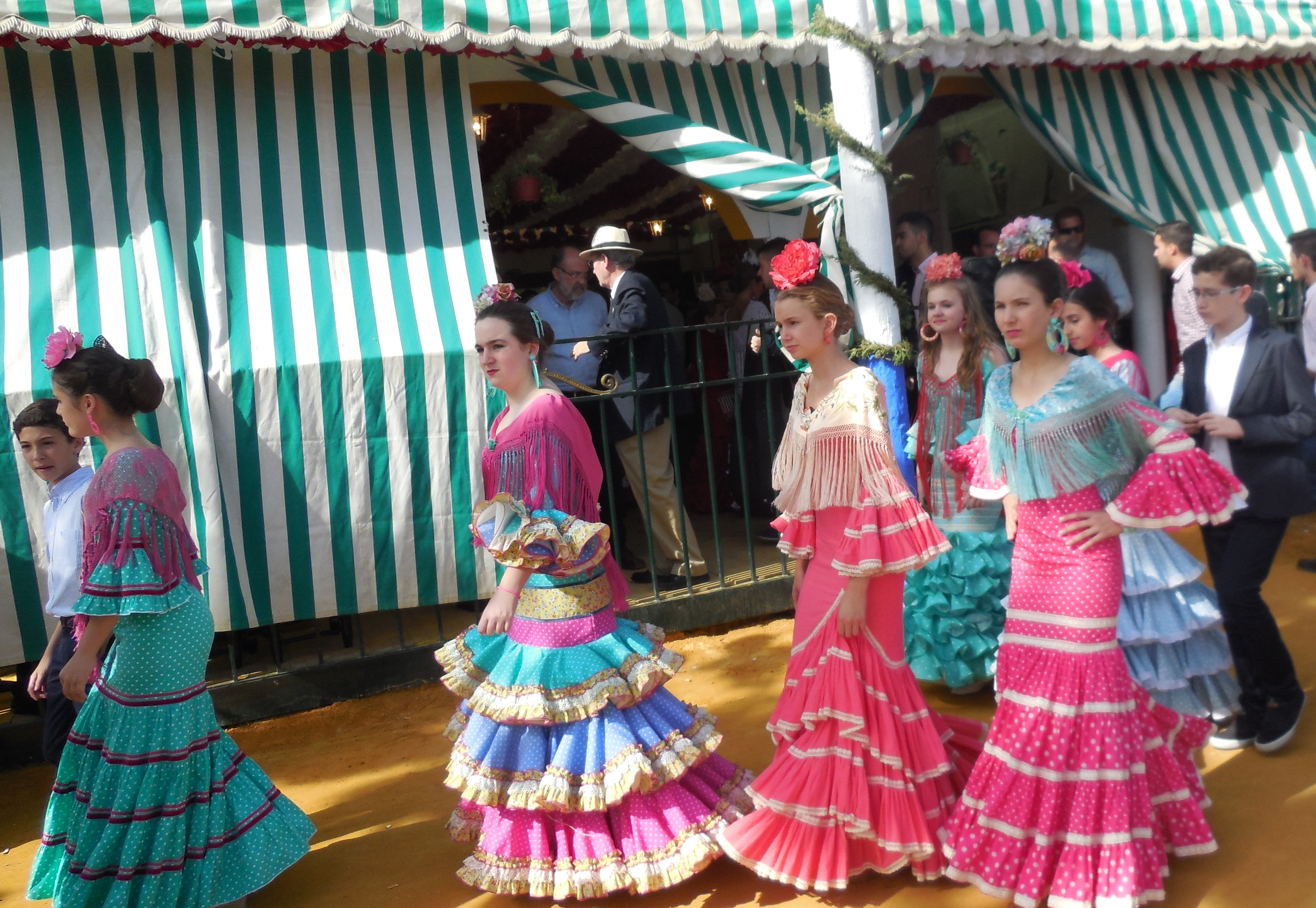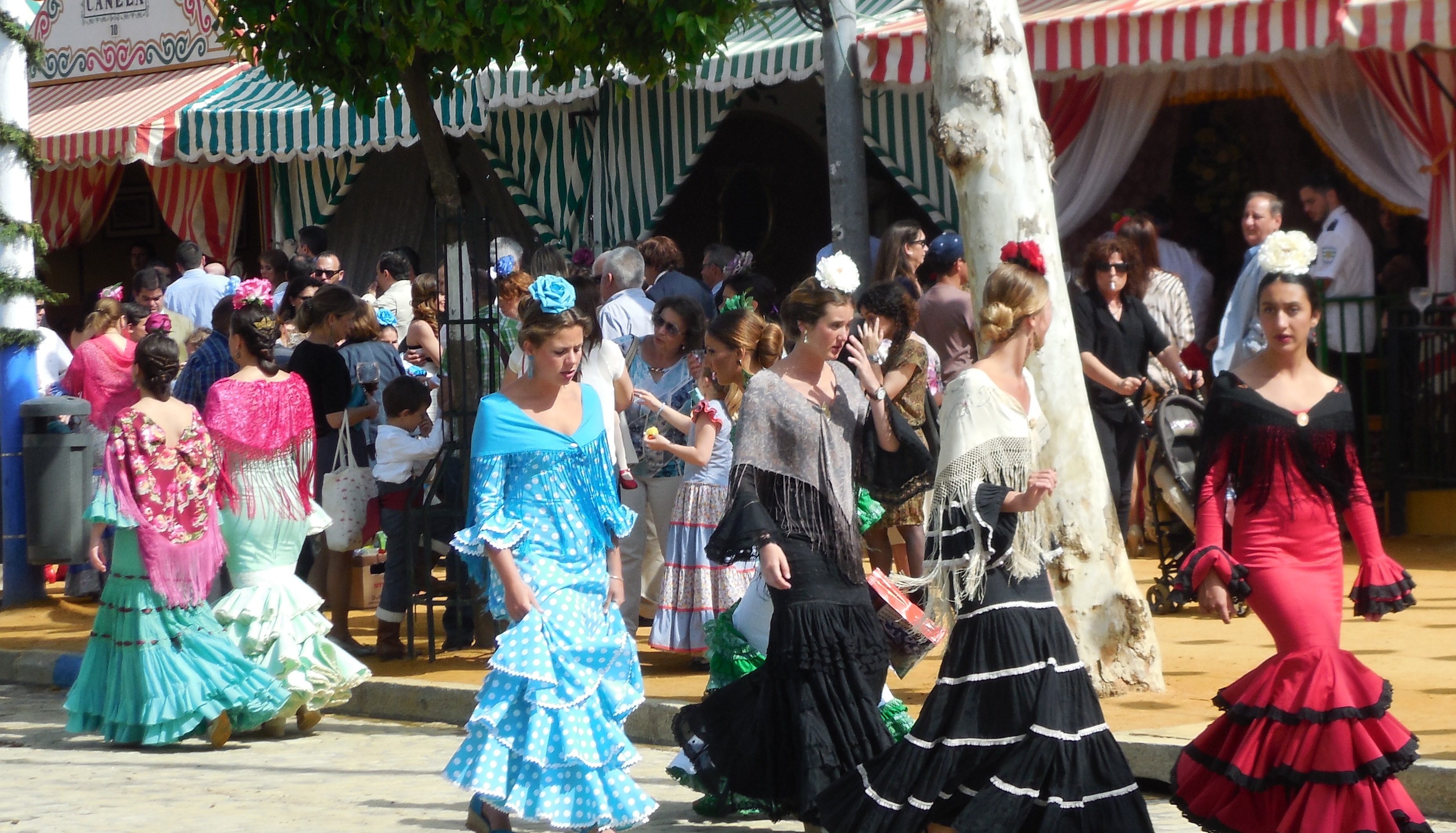 During the six days of the Feria, most people dress in the traditional Andalusian style. The people embrace the Feria with enthusiasm. The atmosphere is friendly and sociable. People come to the Feria to see and be seen and to have a good time, mostly in family groups. I hope the picture below give a flavour of the event.