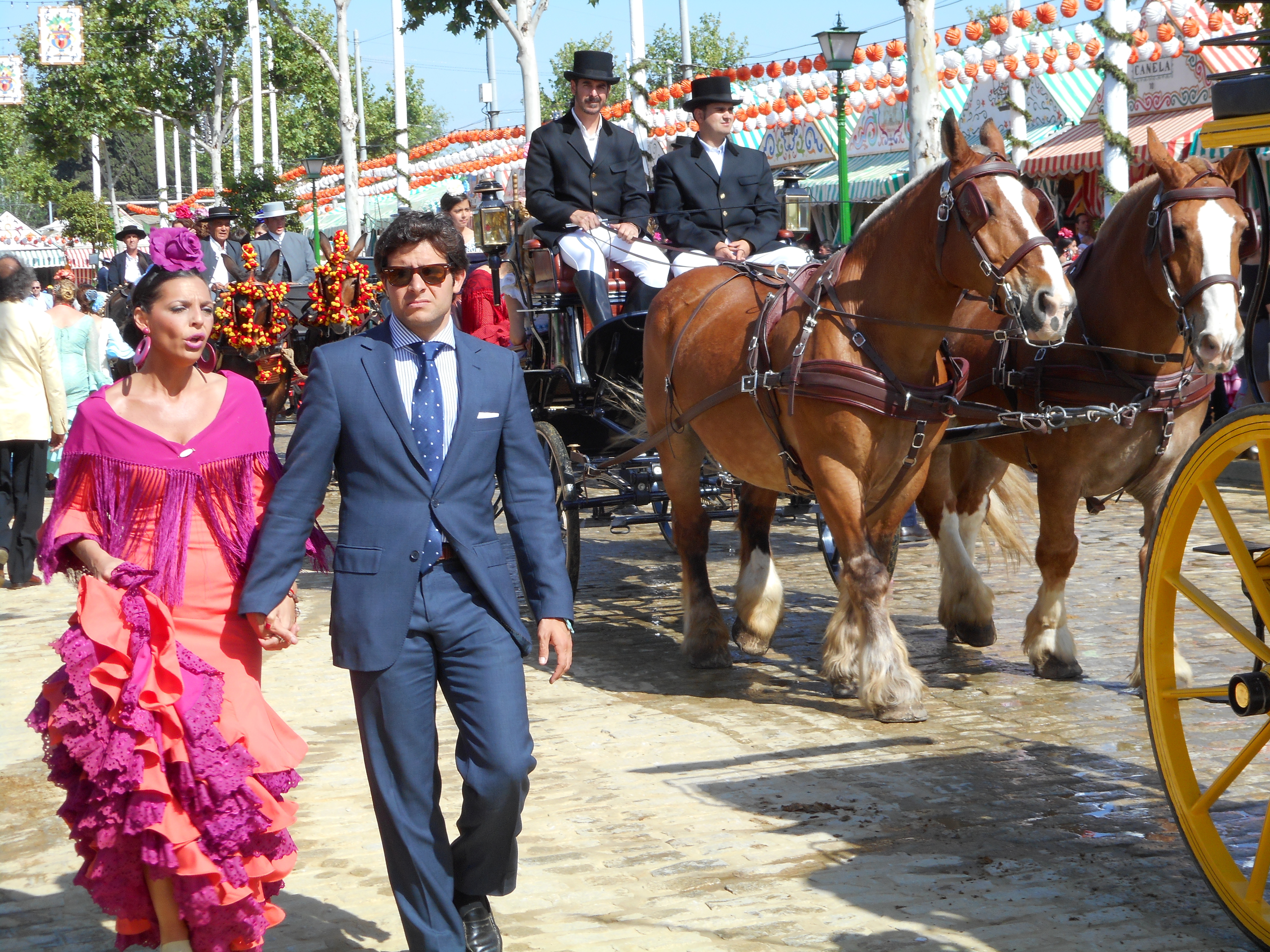The Feria takes place in a huge fairground with hundreds of casetas and thousands of people. The pavements are crammed with people while the roads are dominated by riders and horses.