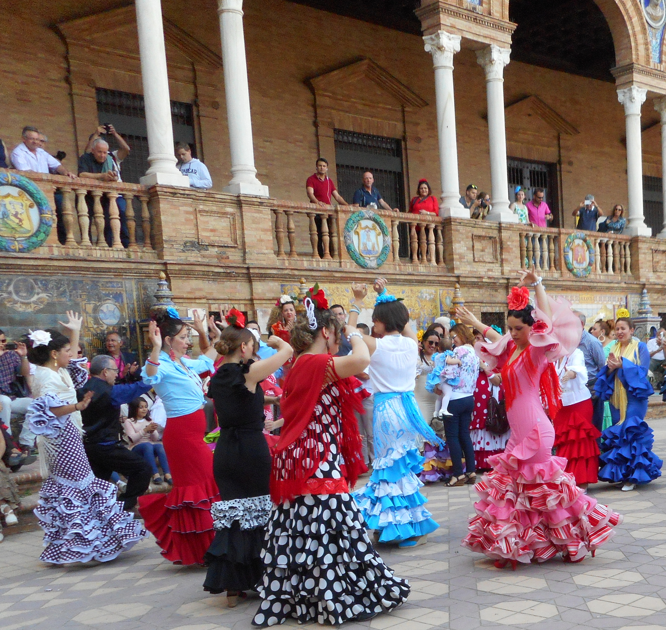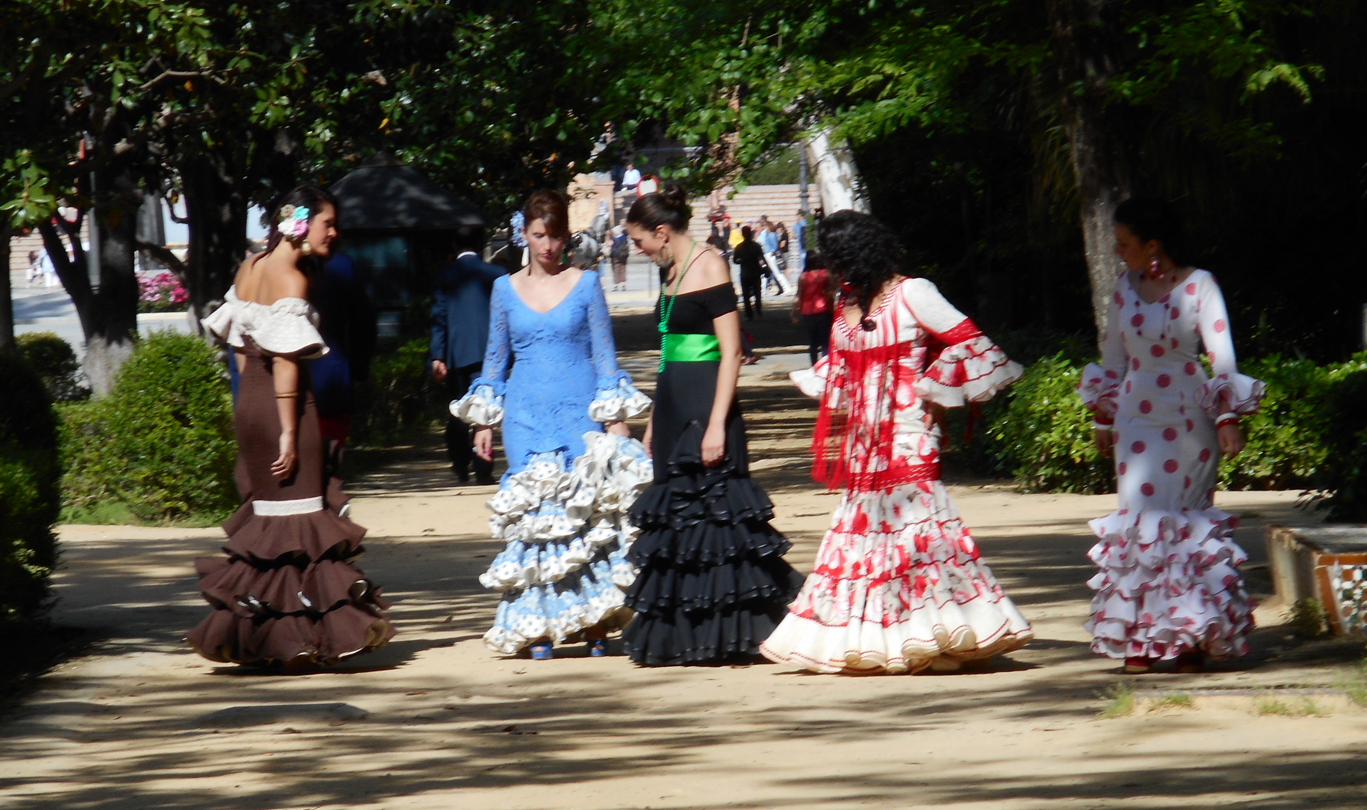 But the spirit of the Feria isn’t limited to the Fair Grounds. The party continues in the nearby Maria Louisa Park and the grounds of the 1929 Expo pavilions. Here, small groups enjoy dancing