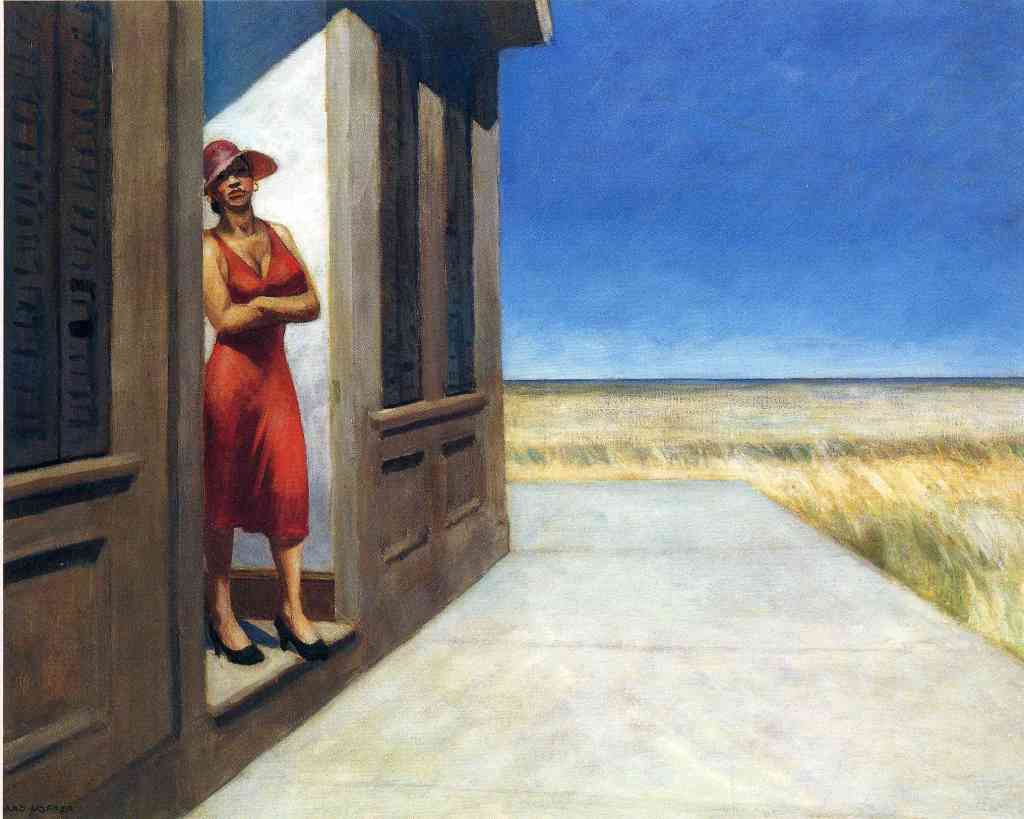Of course, my eyes were caught and held by the woman in the doorway. I wanted to know her story. Her bright red dress and hat and her heels seem out of place in this rural setting. She’s the only woman of colour I’ve seen in any of Hopper’s paintings (odd, given that his work is put forward as capturing the “real” America). Her stance is one I’ve seen many times in many places. It’s a “don’t even think about causing me trouble” and an “I have a right to be here. This is my place. Why are you here and what are you looking at?” stance.