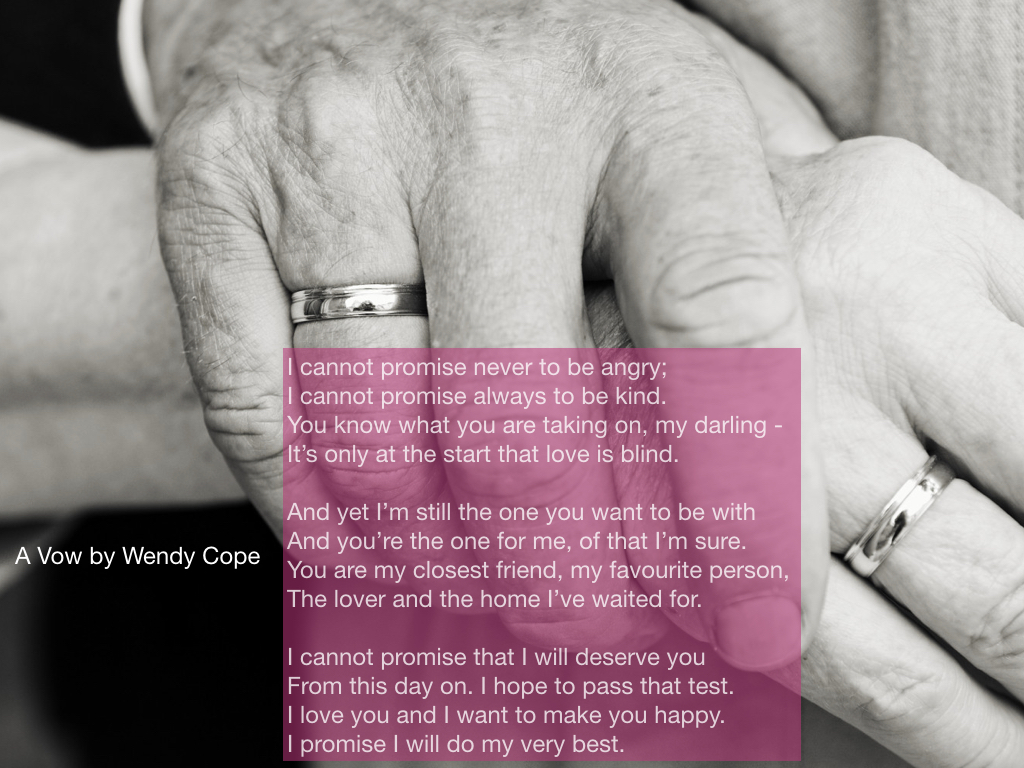 The whole poem works for me. It’s a love I recognise. The line that resonates most is, “I cannot promise that I will deserve you” I’m certain that’s a promise I couldn’t have kept over the decades but, “I love you and I want to make you happy.” is a statement I come back to even in the face of my own failure.