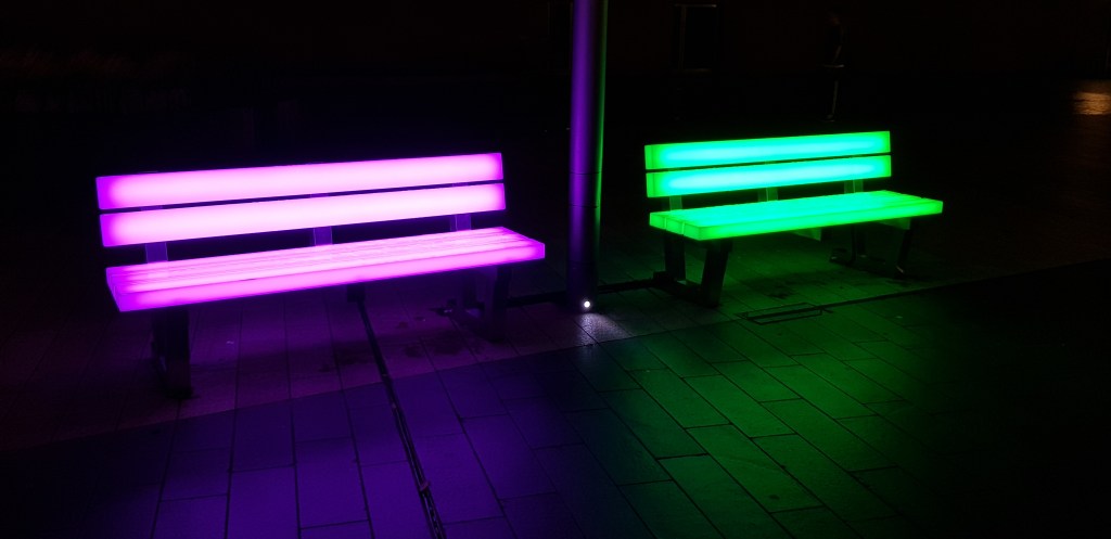Ir’s a simple idea: kit benches with light panels instead of wooden planks and cycle them through a variety of colours.