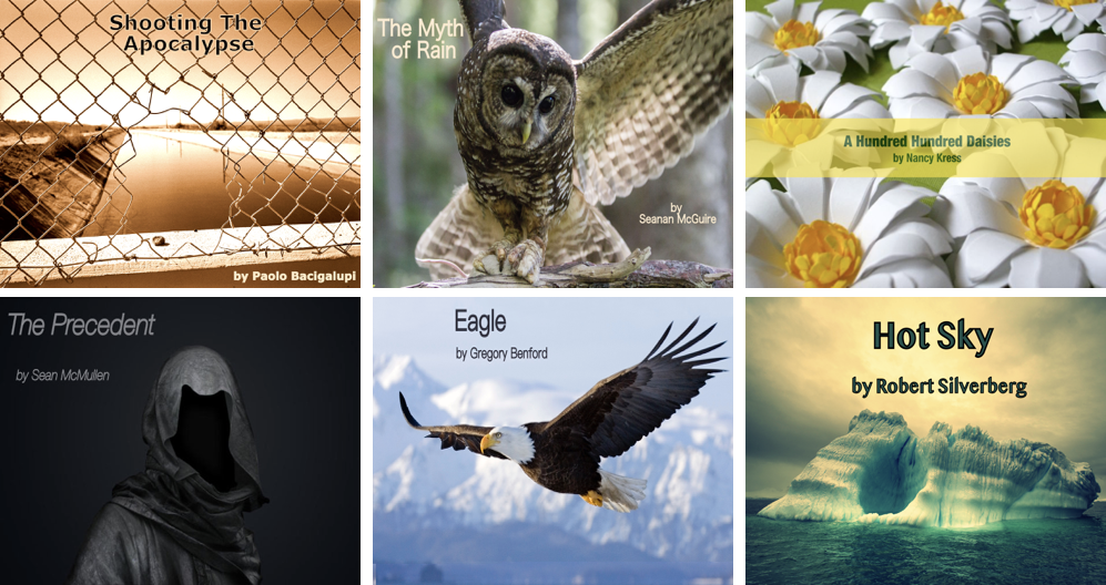 “Shooting The Apocalypse” by Paolo Bacigalupi, “The Myth Of Rain” by Seanan McGuire, “A Hundred Hundred Daisies” by Nancy Kress, “The Precedent” by Sean McMullen, “Eagle” by Gregory Benford and “Hot Sky” by Robert Silverberg.