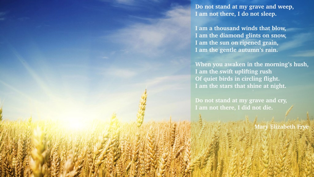 Do not stand at my grave and weep, I am not there, I do not sleep. I am a thousand winds that blow, I am the diamond glints on snow, I am the sun on ripened grain, I am the gentle autumn’s rain. When you awaken in the morning’s hush, I am the swift uplifting rush Of quiet birds in circling flight. I am the stars that shine at night. Do not stand at my grave and cry, I am not there, I did not die.