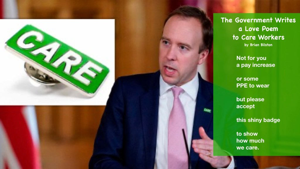 The Government Writes a Love Poem to Care Workers Posted on 21/04/2020 by Mike Finn A poem that says it all Rate this:Share this:Share Click to share on Reddit (Opens in new window) Reddit Click to share on X (Opens in new window) X Click to share on Facebook (Opens in new window) Facebook Like Loading...