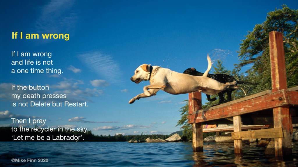 ‘If I am wrong’ by Mike Finn Posted on 08/11/2020 by Mike Finn If I am wrong If I am wrong and life is not a one time thing. If the button my death presses is not Delete but Restart Then I pray to the recycler in the sky, ‘Let me be a Labrador’ ©Mike Finn 2020 Rate this:Share this:Share Click to share on Reddit (Opens in new window) Reddit Click to share on X (Opens in new window) X Click to share on Facebook (Opens in new window) Facebook Like Loading...