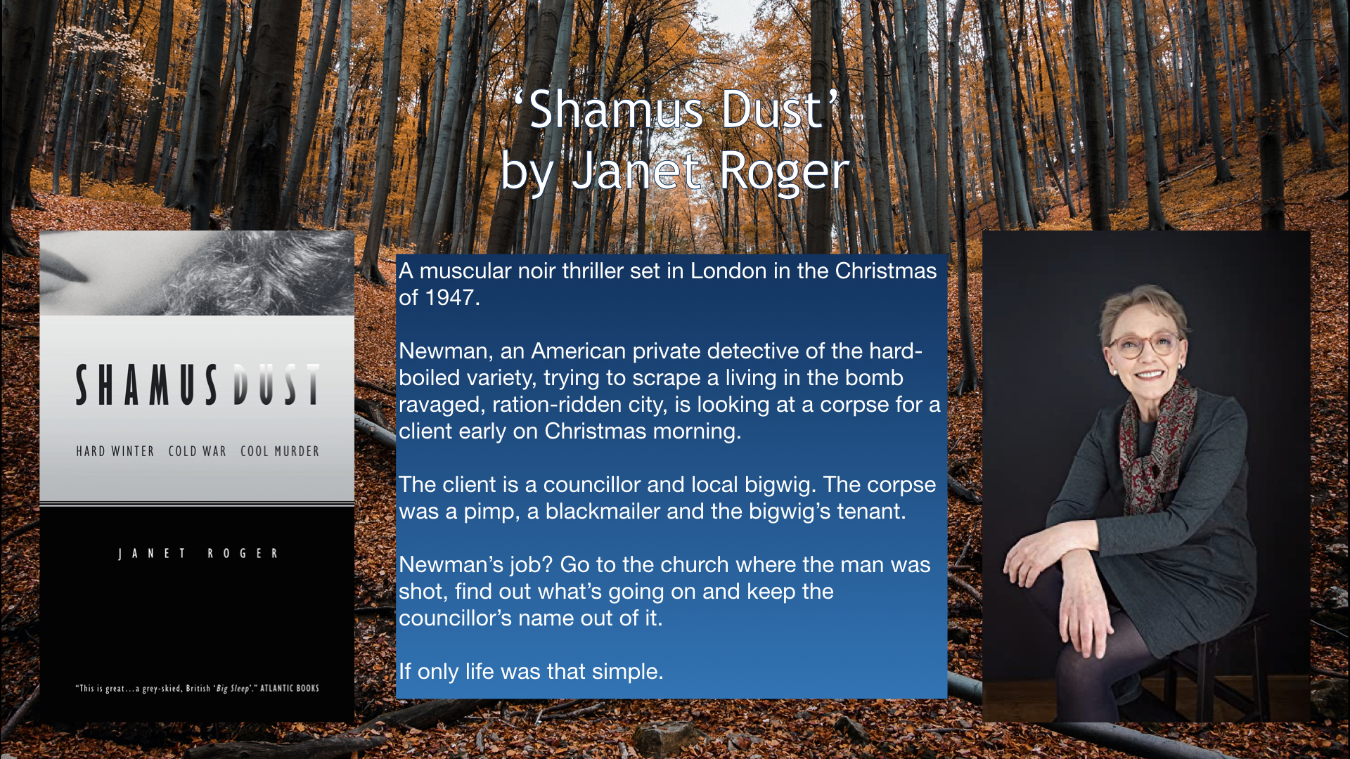 ‘An historical fiction author, writing literary crime. She trained in archaeology, history and Eng. Lit. and has a special interest in the early Cold War.’
