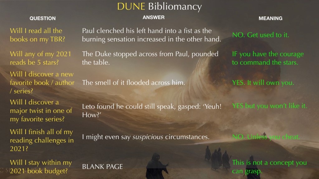 I picked Frank Herbert’s ‘Dune’ which I once saw as a source of much wisdom (Hey, ‘fear is the mind-killer’ sounded pretty profound when I was eighteen). Here’s what the book told me and what I think it means.
