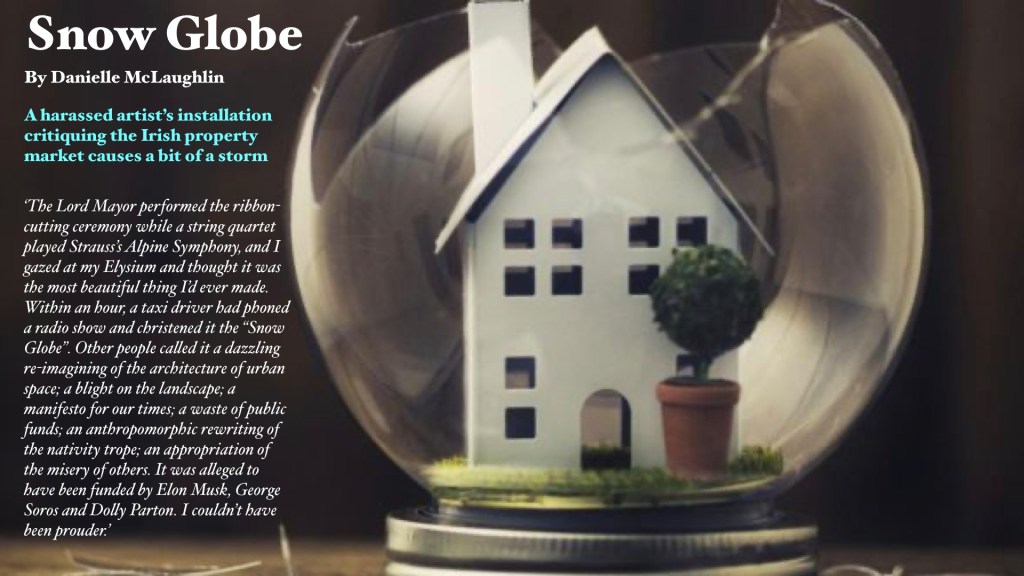 I was delighted to see that a new short story by Danielle McLaughlin, ‘Snow Globe’ was published in the Irish Times. It’s a wonderful story that manages to take a tilt at the nature and purpose of public art, homelessness in Ireland and the absurdities of the property market while remaining a very human story about the woman who makes the art while dealing with the aftermath of her divorce and looking after her child.