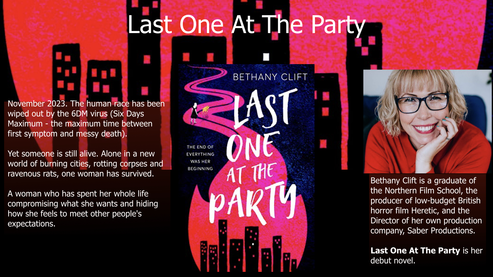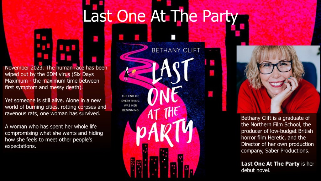 ‘Last One At The Party’ is written in a journal-style that is sort of Bridget Jones minus the optimism and most of the humour. Much of the content, told as memories of our heroine’s past, covers the kind of topics that are typically Rom-Com material. Yet the description of a pandemic that kills everyone within six days of firsts symptoms is chillingly realistic. The descriptions of the corpse-strewn world our heroine navigates are gruesome, deeply sad but never exploitative.