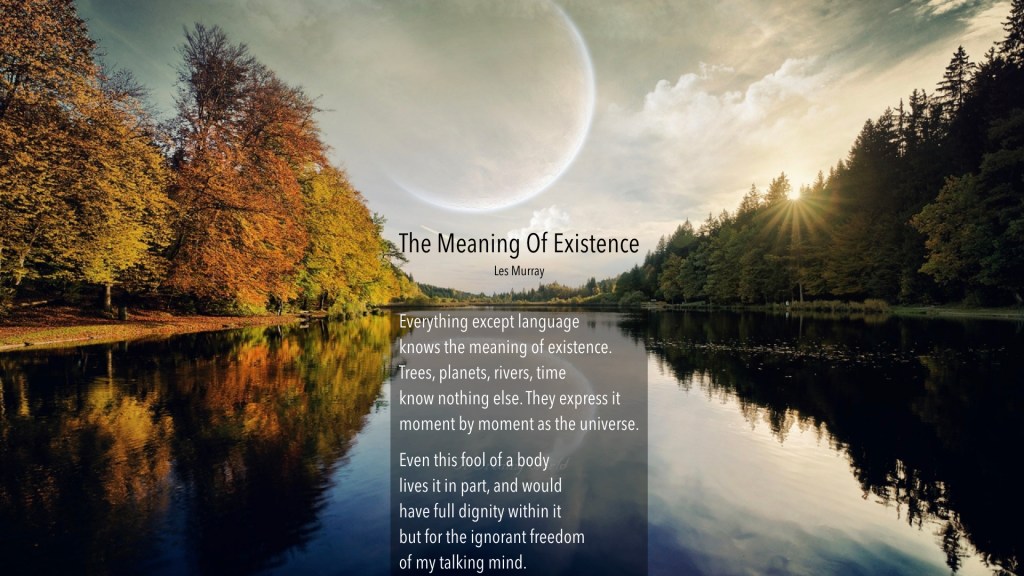 I hit the jackpot with a poem from Les Murray. an Australian poet with a talent for turning rage into poetry. What better poem could I give my dog to chew on than something called ‘The Meaning Of Existence’?