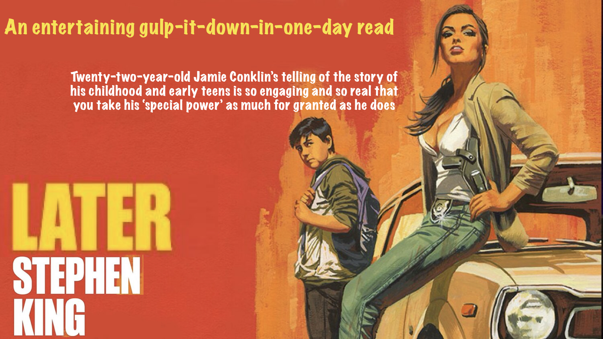 ‘Later’ is pure reading pleasure from the first page. Stephen King is one of my favourite storytellers and my favourite stories of his are the ones that are tightly told, usually from the point of view of a child or someone looking back on childhood and where the horror element is real, scary but not overwhelming. ‘Later’ hits all those points and does it with the easy grace of a writer on the top of his form.