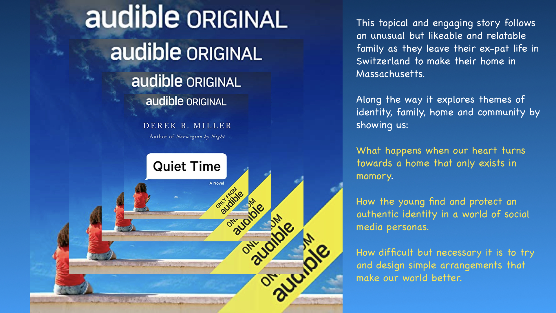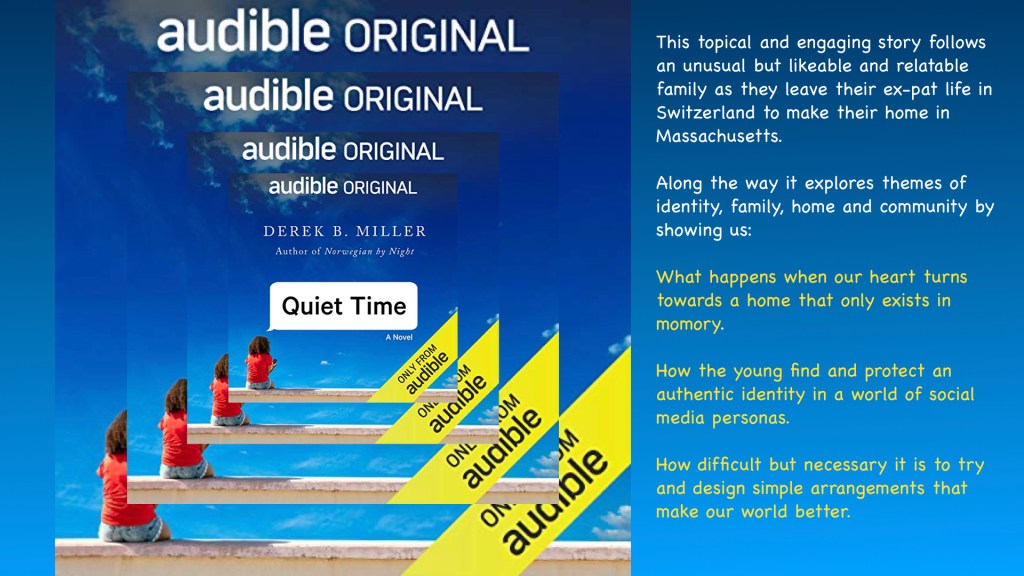 One of the things that I admire most about ‘Quiet Time’ is Derek Miller’s ability to write about real people dealing with real-world issues while keeping a light touch and a human focus. The book is filled with humour without trivialising what’s going on. He tells his story through the characters rather than about them. His dialogue sparkles with wit but also gives distinctive voices to the main characters.