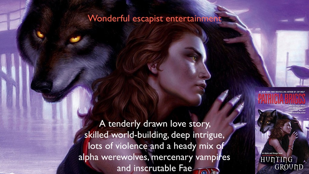 I picked ‘Hunting Ground’ up because it’s been in my TBR pile for three years, because I’ve missed reading Patricia Briggs and because I wanted something quick and easy I could read on my iPad while sitting in the sun in the garden (note to self: love my iPad mini but the screen doesn’t handle glare well – get a Kindle Paperwhite ASAP).