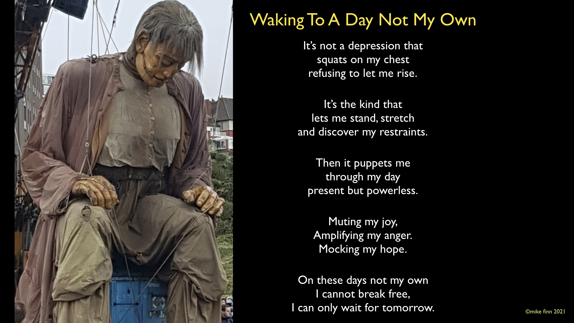 ‘Waking to a day not my own’ by Mike Finn Posted on 17/05/2021 by Mike Finn Yesterday was not a good day. This is my attempt to exorcise it and move on. Rate this:Share this:Share Click to share on Reddit (Opens in new window) Reddit Click to share on X (Opens in new window) X Click to share on Facebook (Opens in new window) Facebook Like Loading...