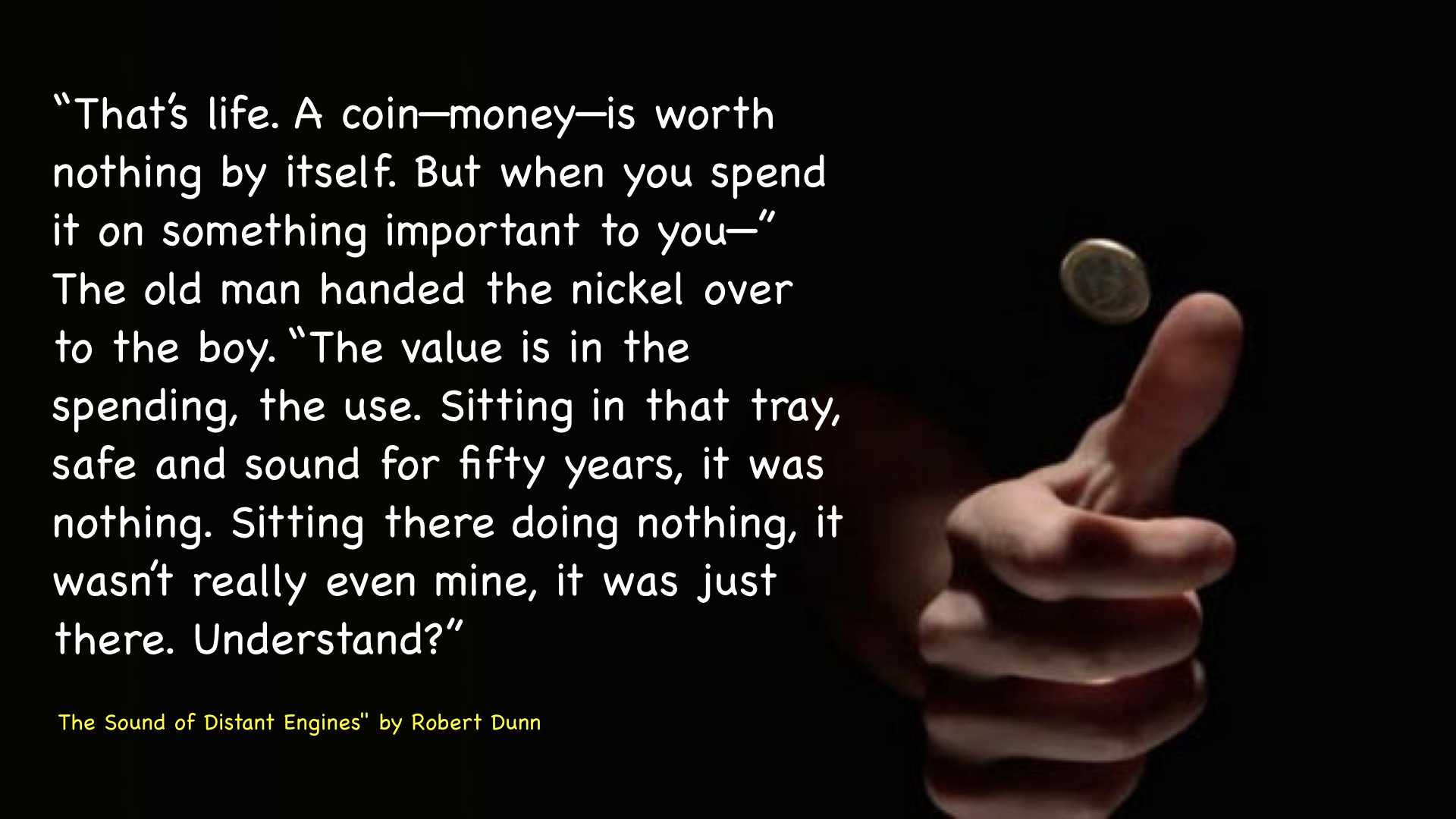 “That’s life. A coin—money—is worth nothing by itself. But when you spend it on something important to you—” The old man handed the nickel over to the boy. “The value is in the spending, the use. Sitting in that tray, safe and sound for fifty years, it was nothing. Sitting there doing nothing, it wasn’t really even mine, it was just there. Understand?”