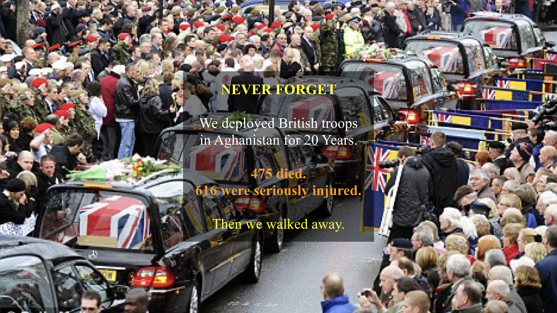 The photograph at the top of this post was taken in Wooten Bassett, Wiltshire, ten years ago. This small town of a little over 11,000 people was the close to RAF Lyneham, the airbase that UK armed forces dead were repatriated to from Afghanistan. More 100 funeral cottages passed through Wootten Bassett. Over time, the people there started to line the streets to honour the dead. One day in 2009, when the cortage was for eights dead service personnel, an estimated 4,000 people lined the route of the cortage and national media started to pay attention.