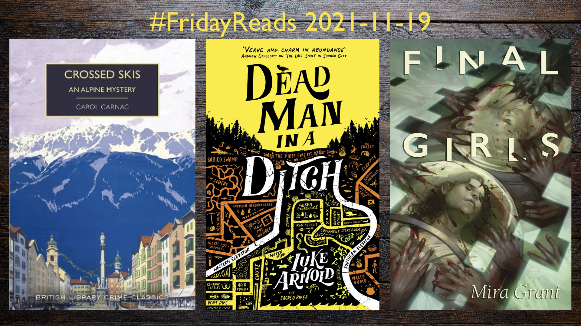This week I’m indulging in a genre smörgåsbord, serving myself a well-matured Golden Age Mystery, a freshly made Supernatural Fantasy and a sliver of horror. The Golden Age Mystery is part of my ‘Cold Comfort Reads’ challenge. It’s a chance for me to get back to winter in the Alps. The Supernatural Fantasy is the second book in a new series that I discovered this year, written in a Noir style. The final book is a novella that promises to be all kinds of weird.