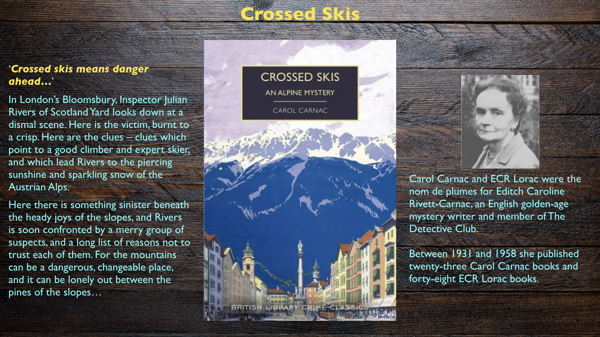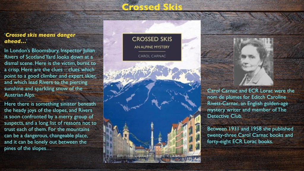 ‘Crossed Skis’ will be the twenty-third Golden Age Mystery. that I’ve read in the past few years. Originally, I read them as companion pieces as I read my way through Agatha Christies novels. I was amazed to discover how many mysteries there were out there by authors I didn’t know and how good they were. The best feel as fresh as if they were written yesterday but give me an insight into the times that they were written in. Many of the authors are women who, like Edith Caroline Rivett-Carnac, were pioneers in making their living by their writing one or more books a year, sometimes under multiple pen names. It seems to me that, for this generation of women writers, crime writing was the equivalent of religious art in the Middle Ages – it was what people would pay you to do so people poured their talent into the accepted form and the best of them created something that stands on the quality of the work.