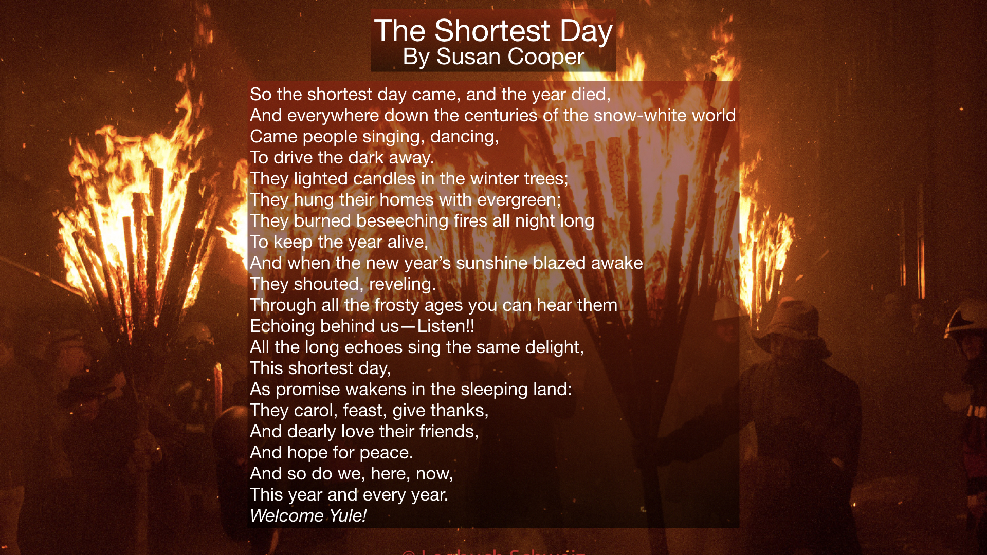 THE SHORTEST DAY BY SUSAN COOPER So the shortest day came, and the year died, And everywhere down the centuries of the snow-white world Came people singing, dancing, To drive the dark away. They lighted candles in the winter trees; They hung their homes with evergreen; They burned beseeching fires all night long To keep the year alive, And when the new year’s sunshine blazed awake They shouted, reveling. Through all the frosty ages you can hear them Echoing behind us—Listen!! All the long echoes sing the same delight, This shortest day, As promise wakens in the sleeping land: They carol, feast, give thanks, And dearly love their friends, And hope for peace. And so do we, here, now, This year and every year. Welcome Yule!