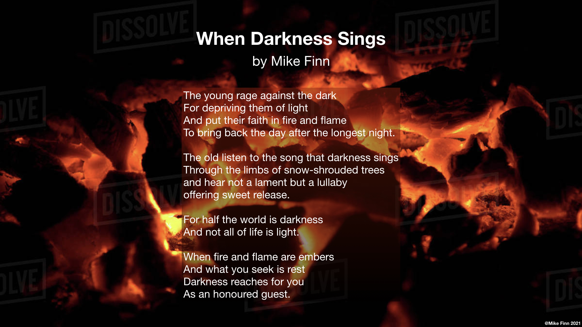 WHEN DARKNESS SINGS BY MIKE FINN The young rage against the dark For depriving them of light And put their faith in fire and flame To bring back the day after the longest night. The old listen to the song that darkness sings Through the limbs of snow-shrouded trees and hear not a lament but a lullaby offering sweet release. For half the world is darkness And not all of life is light. When fire and flame are embers And what you seek is rest Darkness reaches for you As an honoured guest.