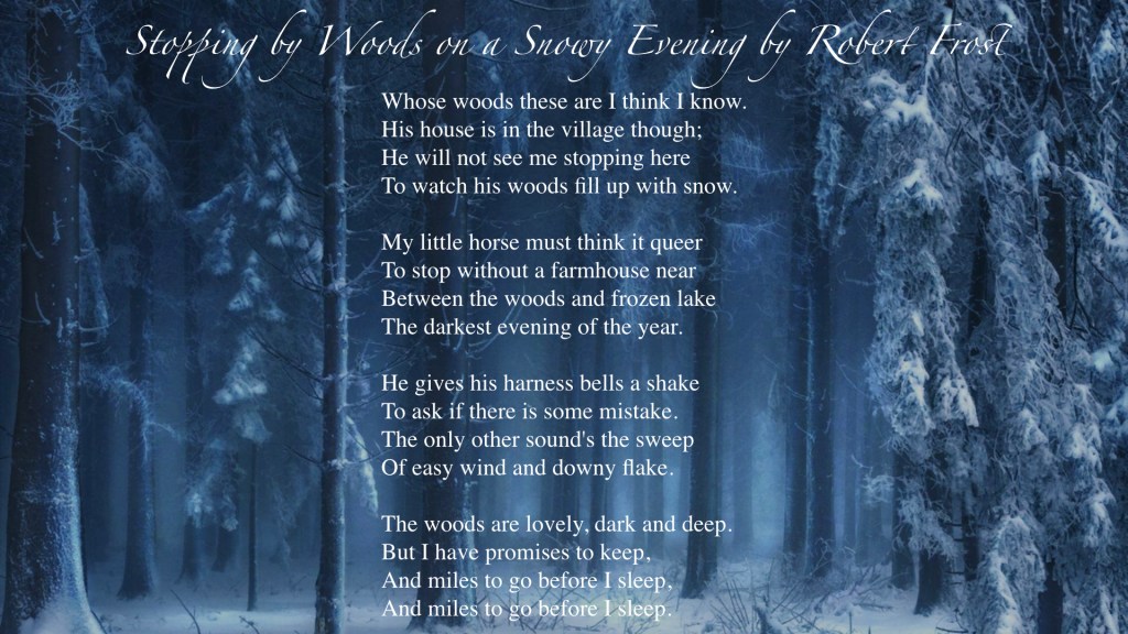 For I’ve been to the woods in the snow and the dark and I know their silent song. I’ve driven through beautiful landscapes that I have no time to pause and admire because I had promises to keep. I know how it feels to ‘have miles to go before I sleep’ and yet to go anyway.