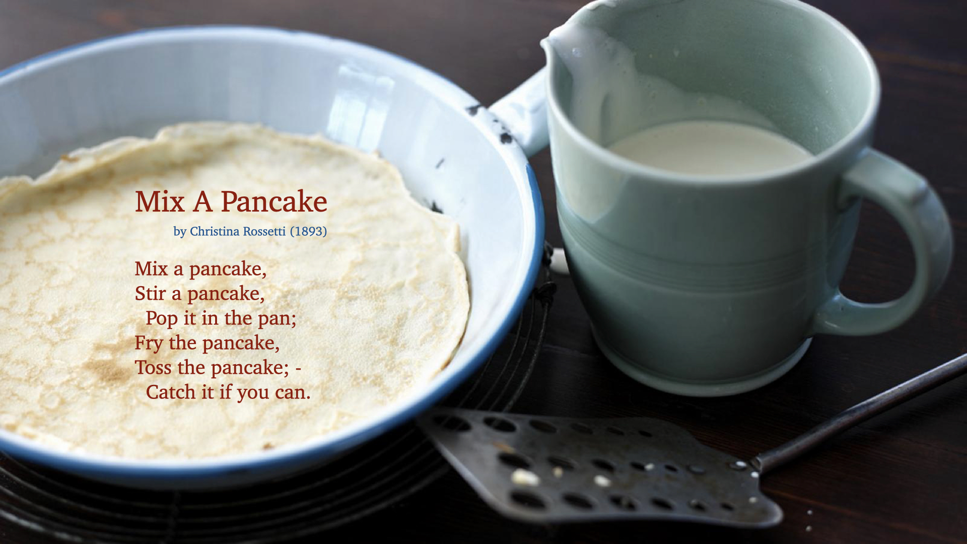 These days, my wife makes the pancakes on Pancake Tuesday. She follows the steps in Christina Rossetti’s poem. She mixes a batter with flour and eggs and sunflower oil then lets it stand. She ladles a portion into a hot frying pan and lets it brown without burning. She tends to flip rather than toss, which is a much more reliable way of making sure there’s a pancake to put on the plate.