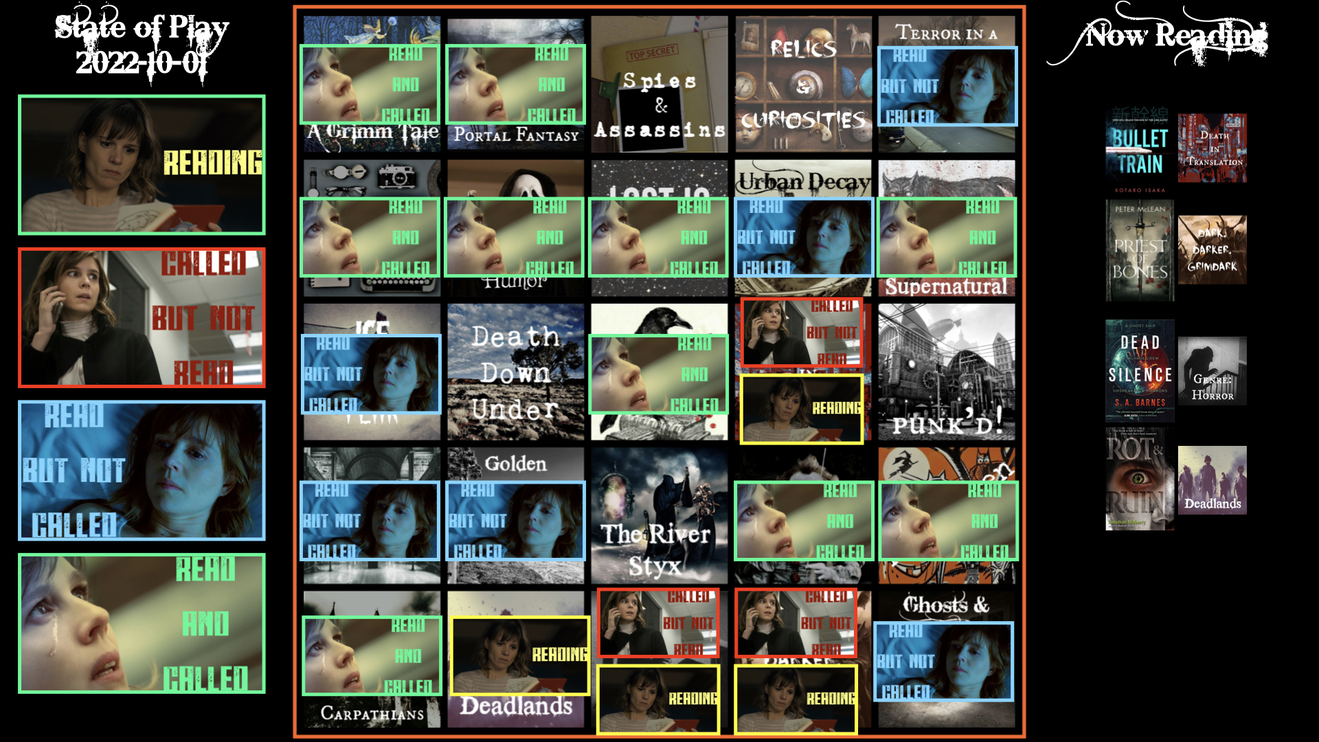 So far, I’ve read books for 16 of the 25 squares, including 11 of the 14 Called squares on my card. I have four complete lines (one row, one column and both diagonals) but, in each case, I’m at least one call away from a bingo.