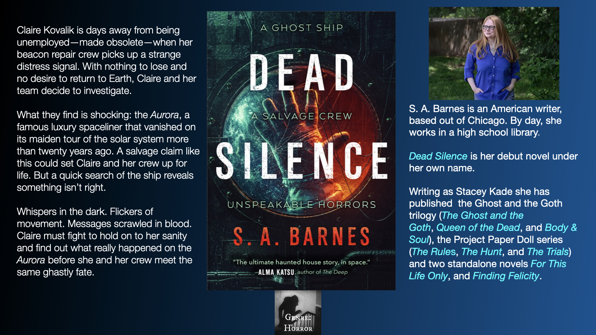 Then I saw that, although this is her ninth novel, it’s the first one published under her own name. I figure this means that ‘Dead Silence’ is a book S. A. Barnes is invested in.