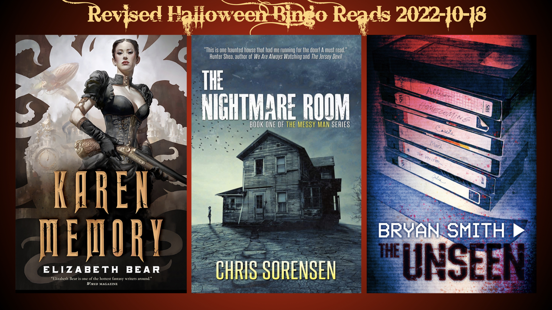 Letting Halloween Bingo drive my reading means that the best word to describe this week’s books is, diverse. One is a steampunk alternative history set in late 19th Century Seattle. One is a haunted house story written by an audiobook narrator about an audiobook narrator, One is a darker piece about cursed VHS tapes showing unseen versions of movies from the Friday The 13th franchise. It should be a fascinating week.