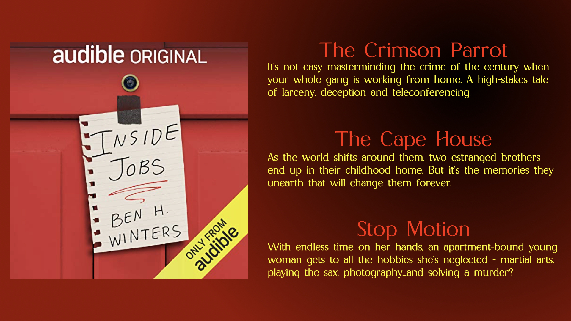 If you have a few hours to fill and you want to take a trip back to 2020 headspace, give ‘Inside Jobs’ a try. Each story has its own narrator and they all do a great job.