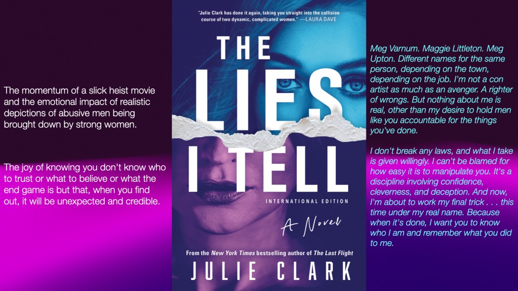 In ‘The Lies I Tell’, Julie Clark delivered another original and compelling thriller with two women at its centre. This had all the tension and cleverness of a heist movie, only without the male smugness and with the added gratification of seeing abusive men get what they deserve.