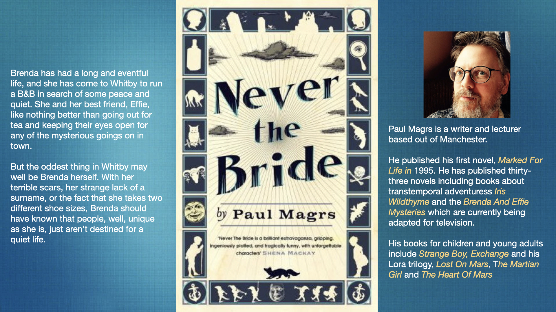 Paul Magrs is a first-time read for me. The premise sounds off-beat and could turn out to be wonderful. It’s set in Whitby, which I’ve visited several times, so I should be able to visualise the action. Best of all, my wife has already read it and enjoyed it.