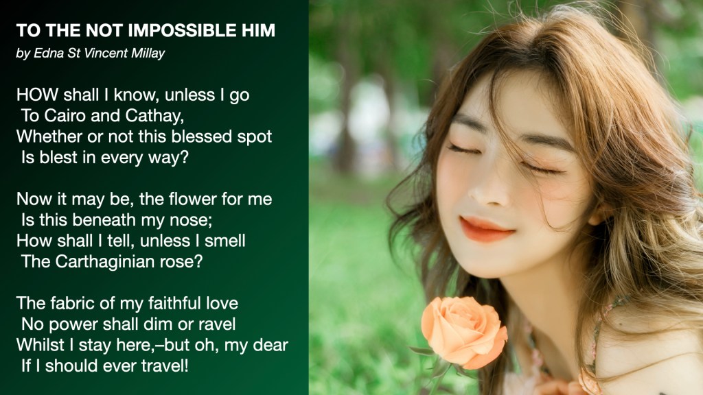 I’d like to share her poem, ‘To The Not Impossible Him’ from that book. It made me smile and it referred to travel.