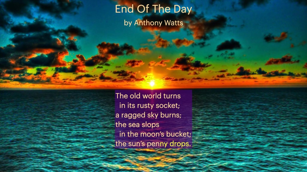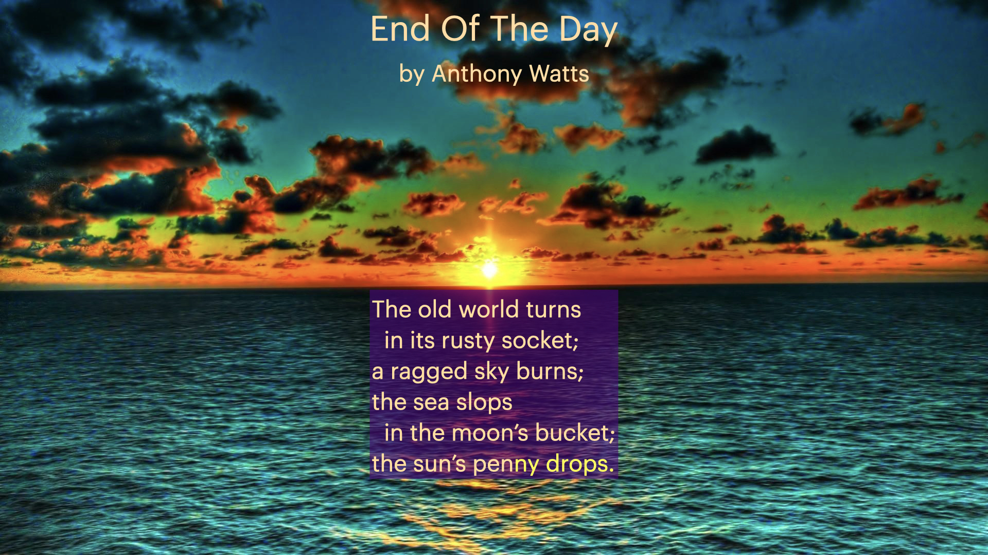 On days like that, I might read Anthony Watt’s poem and experience it as a beautifully crafted set of images, juxtaposed like a stained glass window, to capture the power and the beauty of a sunset.