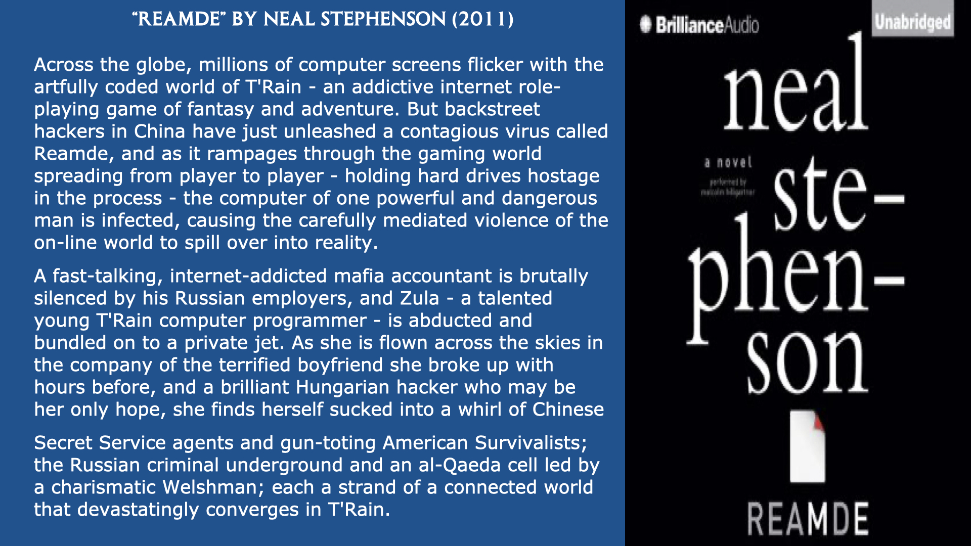 Reamde is more than 34 hours long and I still regretted reaching the end. The opening chapter reads like something from John Irving or Richard Russo. It establishes Richard Forthrast, online war game billionaire and former smuggler, in the context of his Iowa farming clan family which covers the American spectrum from “American Taliban” Freemen, living off the grid, through Vietnam vets working the farms to Zula, Richard’s adopted Eritrean niece. The home team here is American in all its flavours, but the game is played, both online and in real life, on a global stage, stretching through Canada, China, and the Philippines, with characters from the Russian, the UK (a half-chinese British spy, a Scottish fraudster and a black Welsh Jihadist), Hungary, and China.