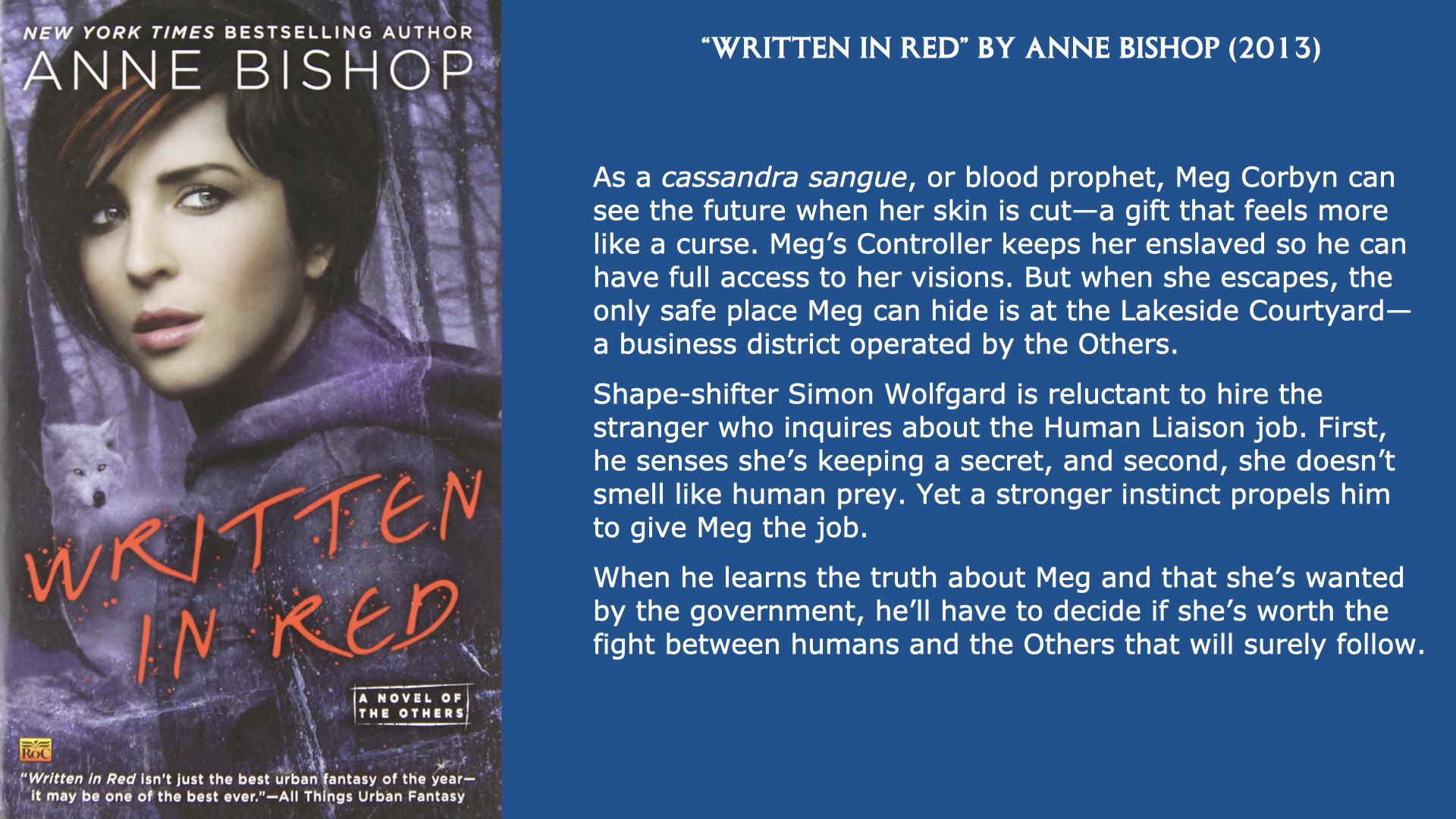 In my view Written In Red is closer to classic science fiction than it is to urban fantasy. Anne Bishop isn’t writing about supernatural creatures roaming city streets. She’s created an alternative reality, imagined the way good science fiction should be: starting with two small changes to our familiar reality – humans are not at the top of the food chain and shapeshifters are not only real but dominant – while keeping everything else the same and then working through the consequences. She then delivers complex, credible, I’m-hungry-to-know-more world-buidling in simple prose. But what makes this book unmissable is the way she made her world real to me by creating characters I cared about and putting them in peril.