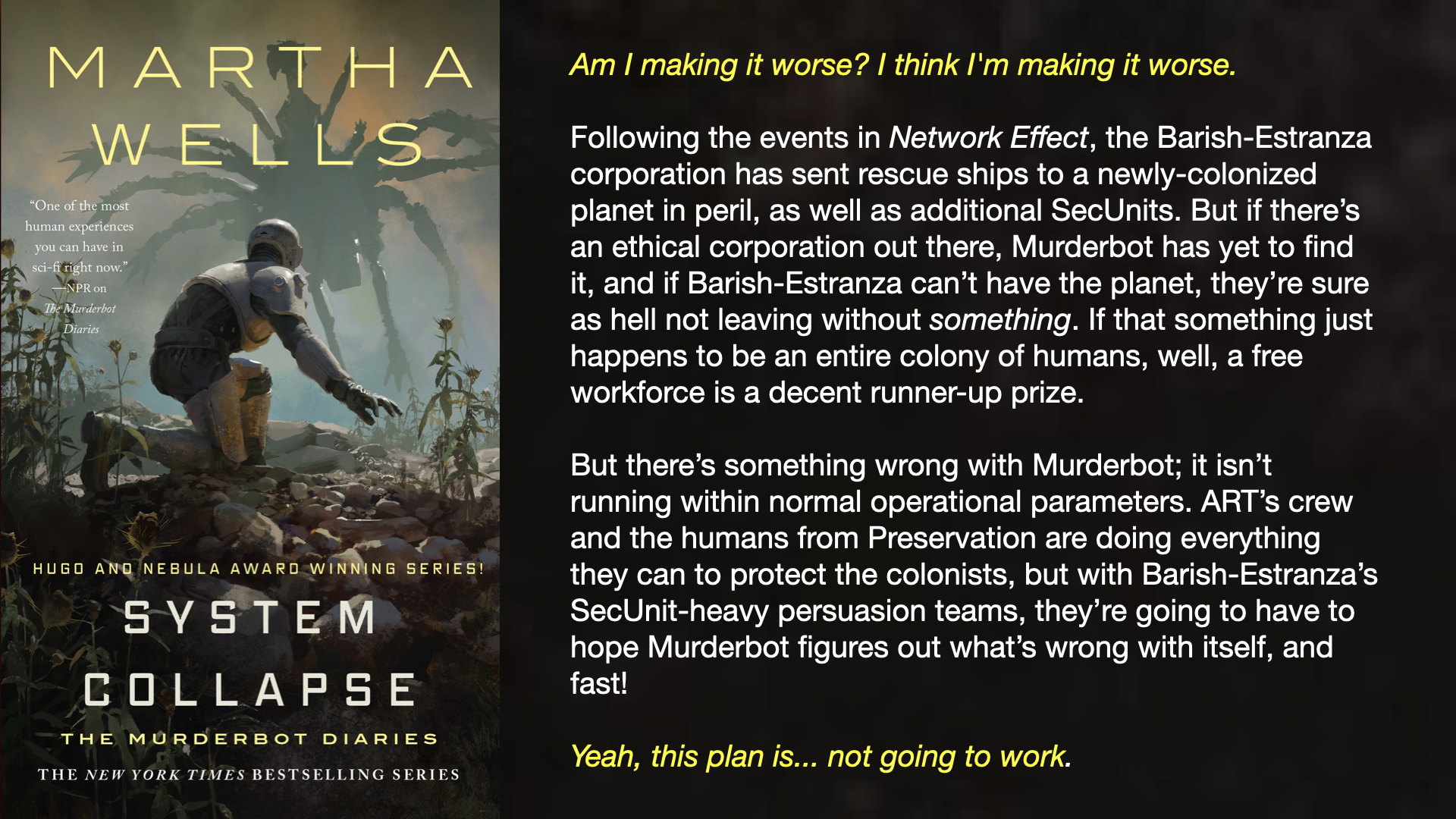System Collapse is the latest book in the Murderbot series that I’ve been following eagerly since 2017.