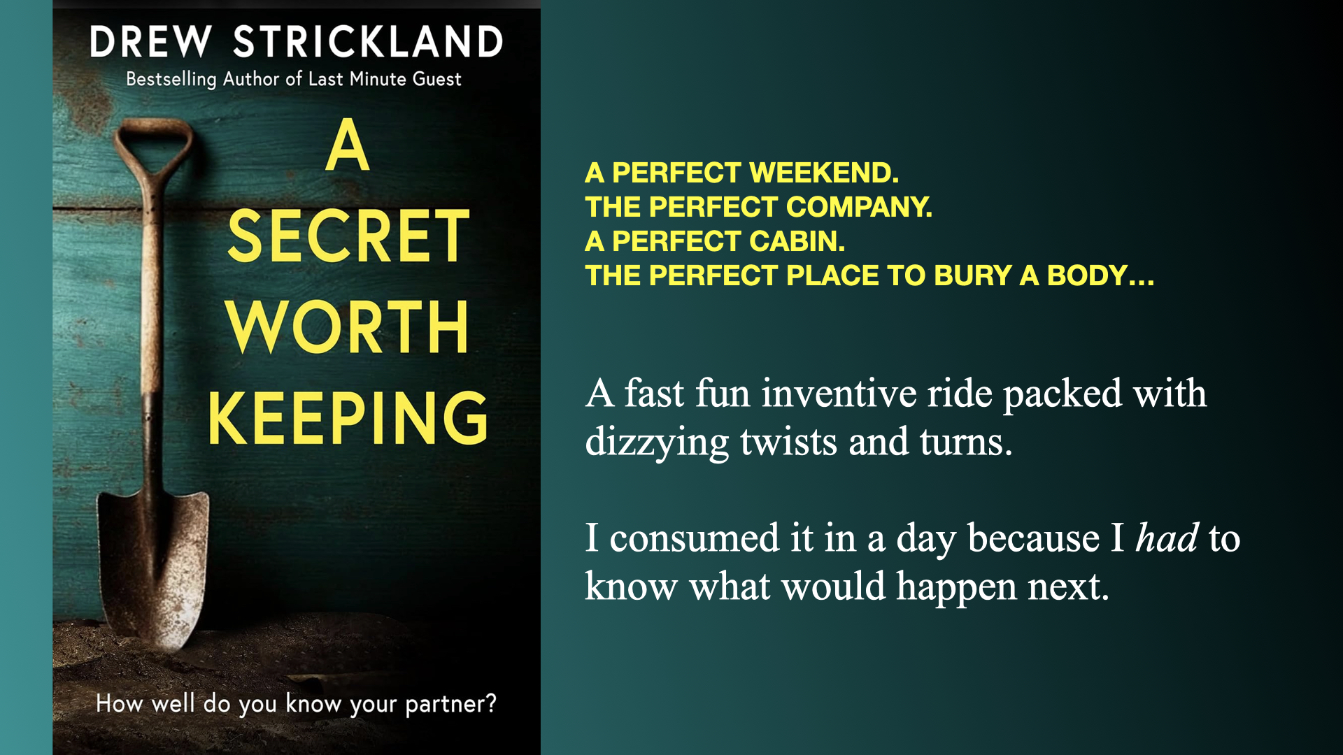 I recommend that you read ‘A Secret Worth Keeping‘ in a single sitting if you can. It’s a book to experience not to ponder over.
