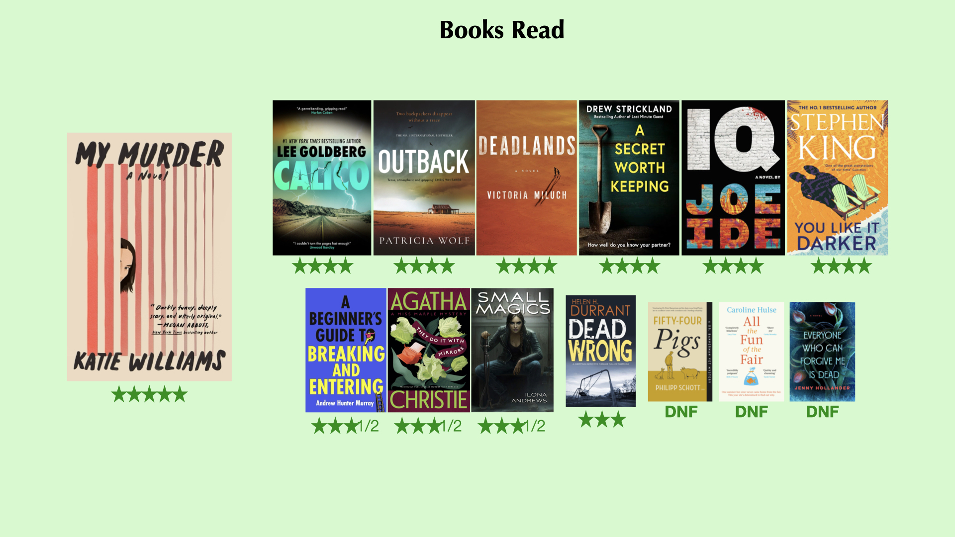 I read 14 books in May. I rated half of them as four-star reads or better. One was outstanding and three of them I set aside. My best read was Katie Williams’ ‘My Murder‘, an original, surprising, beautifully written and often unsettling speculative fiction novel that used a near-future murder mystery to tell the story of a cloned woman who is trying to discover?/build? her own identity and gain agency in a world in which male violence against women is so ubiquitous it seems elemental.