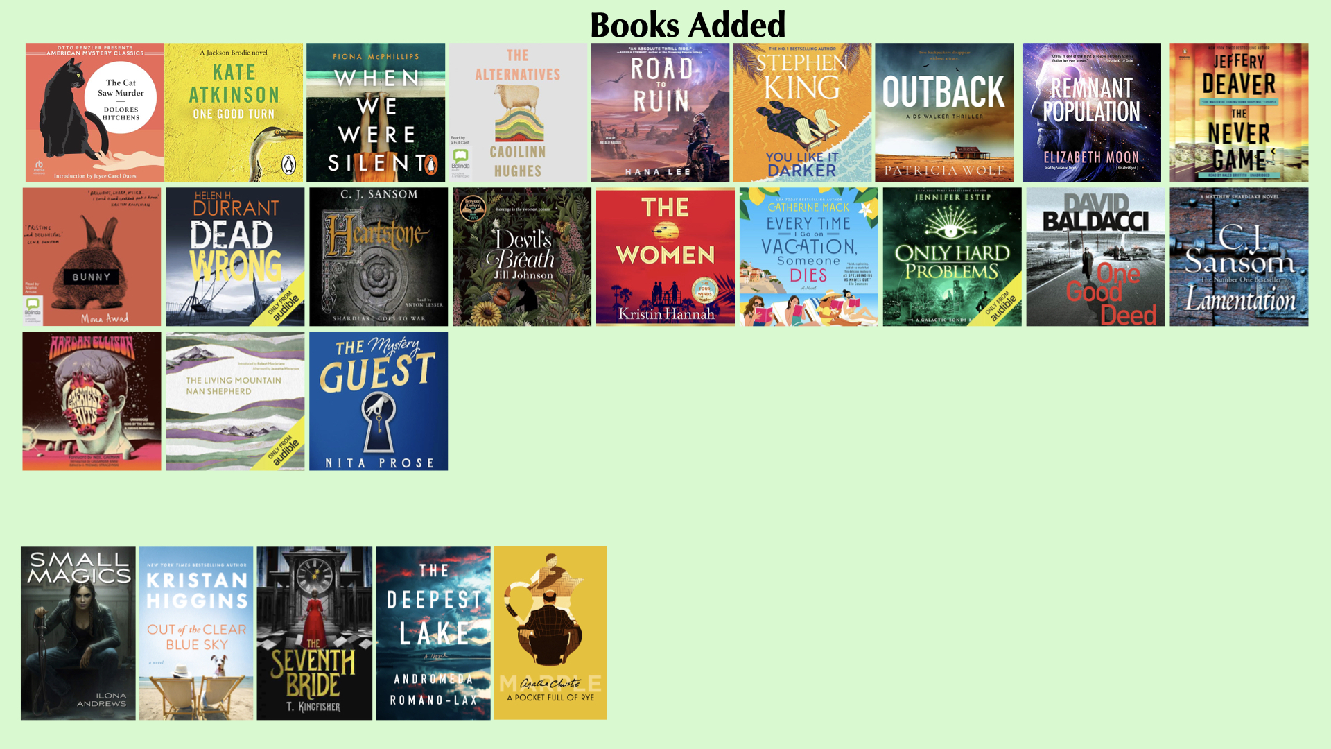 - Year to date I’ve added 123 books of which I’ve read 44 (36%).