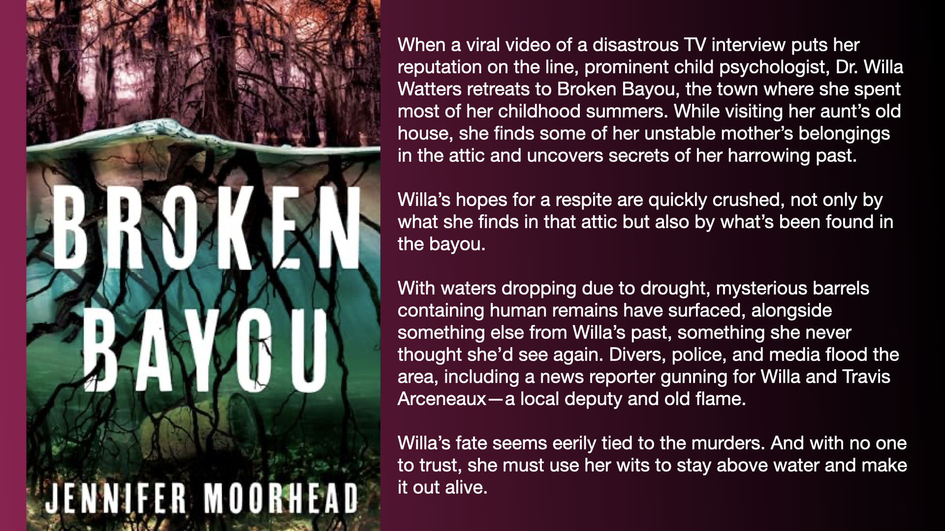 This book is a roll of the dice. It’s a debut novel. It’s a thriller that’s largely written in the first-person present tense, which is great when it works but tiresome when it doesn’t. The setting interests me. Apart from ‘The Pelican Brief’ way back in the distant past, it seems all the books I’ve read set in Louisana involve supernatural creatures. Jennifer Moorhead comes from Louisiana, so I’m hoping she can evoke the spirit of the place.