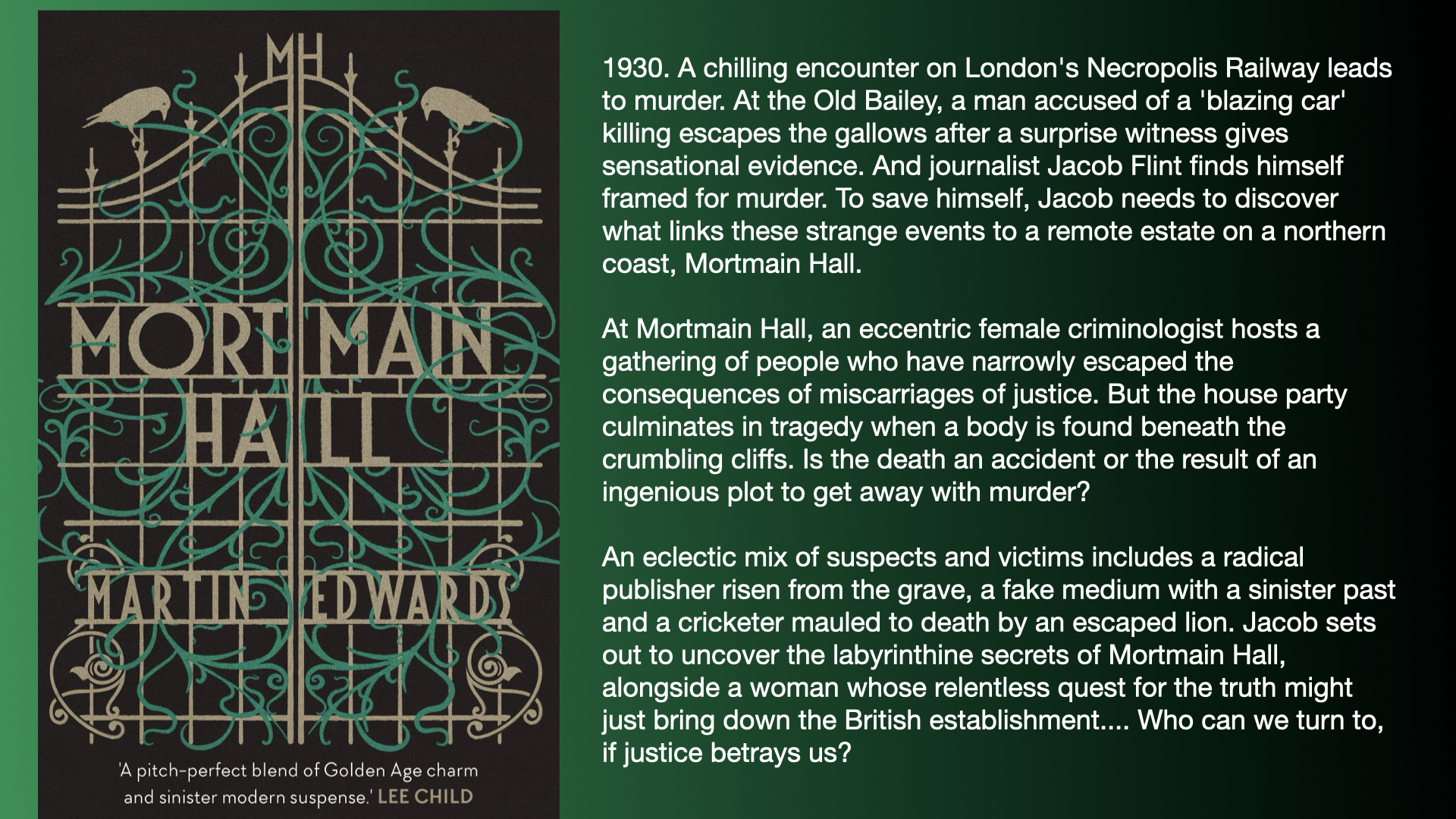 ‘Mortmain Hall’ should be a safe bet as an entertaining read. Few people know as much about Golden Age Mysteries as Martin Edwards and he showed in ‘Gallows Court‘, the first book in the Rachel Savernake series, that he knows how to deliver a good period thriller.