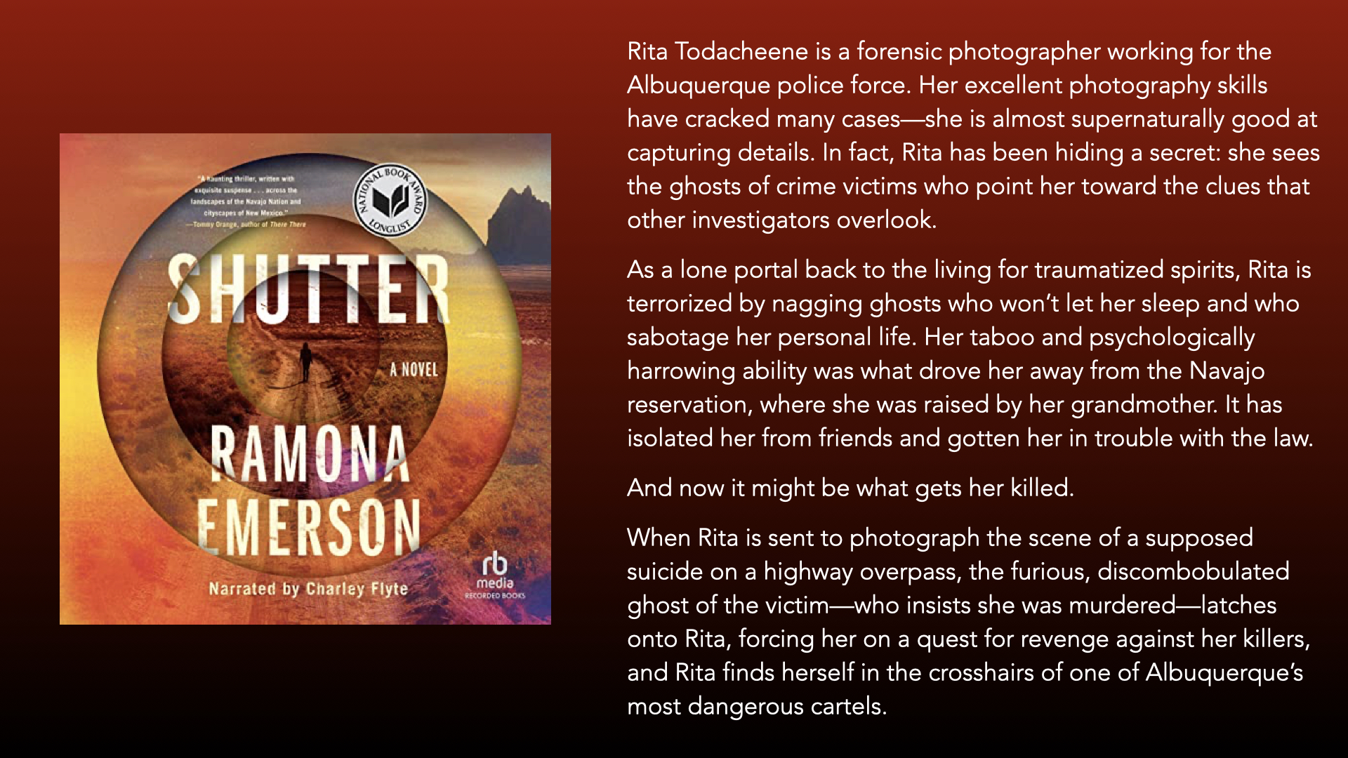 The idea of a Diné woman who works as a crime scene photographer having a gift for seeing the dead called to me even before I learned that Rita Emerson had worked as a forensic videographer.