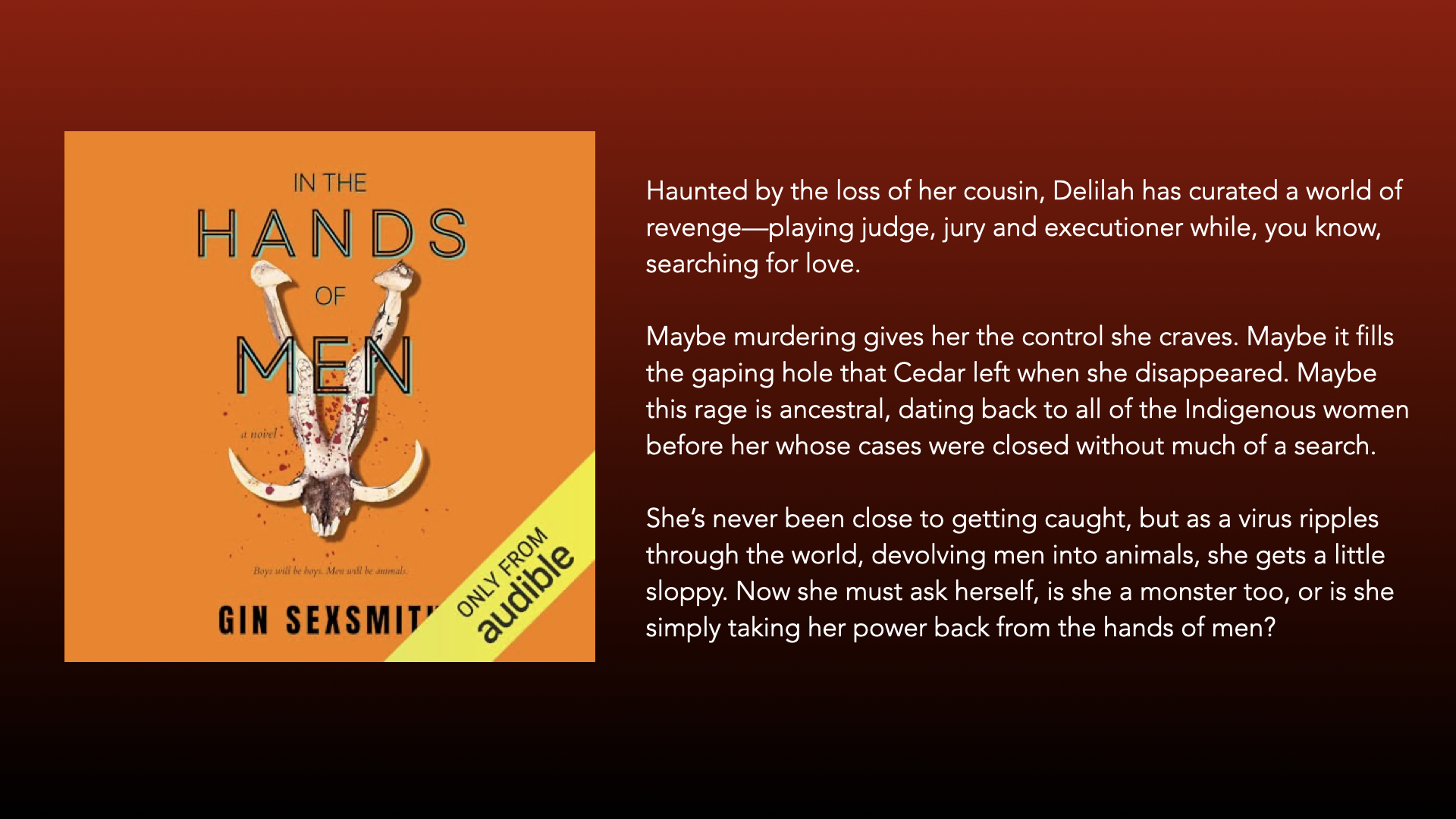 ‘In The Hands Of Men‘ was an Editor’s Choice on Audible and has received fairly positive reviews. I listened to the audible excerpt below and was intrigued. I think this is going to be one of those books that either blows me away or which leaves me feeling that it attempted more than it could deliver. Either way, I’m expecting a read that pushes my boundaries a little.