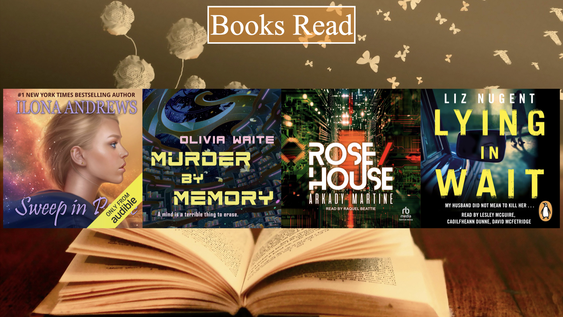 Thk week’a reading was very satisfying and very varied. I finished an Irish crime book that was startlingly orginal, and kicked off a new cosy mystery series set on a spacehip. Then I went off plan a rapidly made my way through a fantasy novel and a speculative fiction novella that I suddently felt in the mood for.