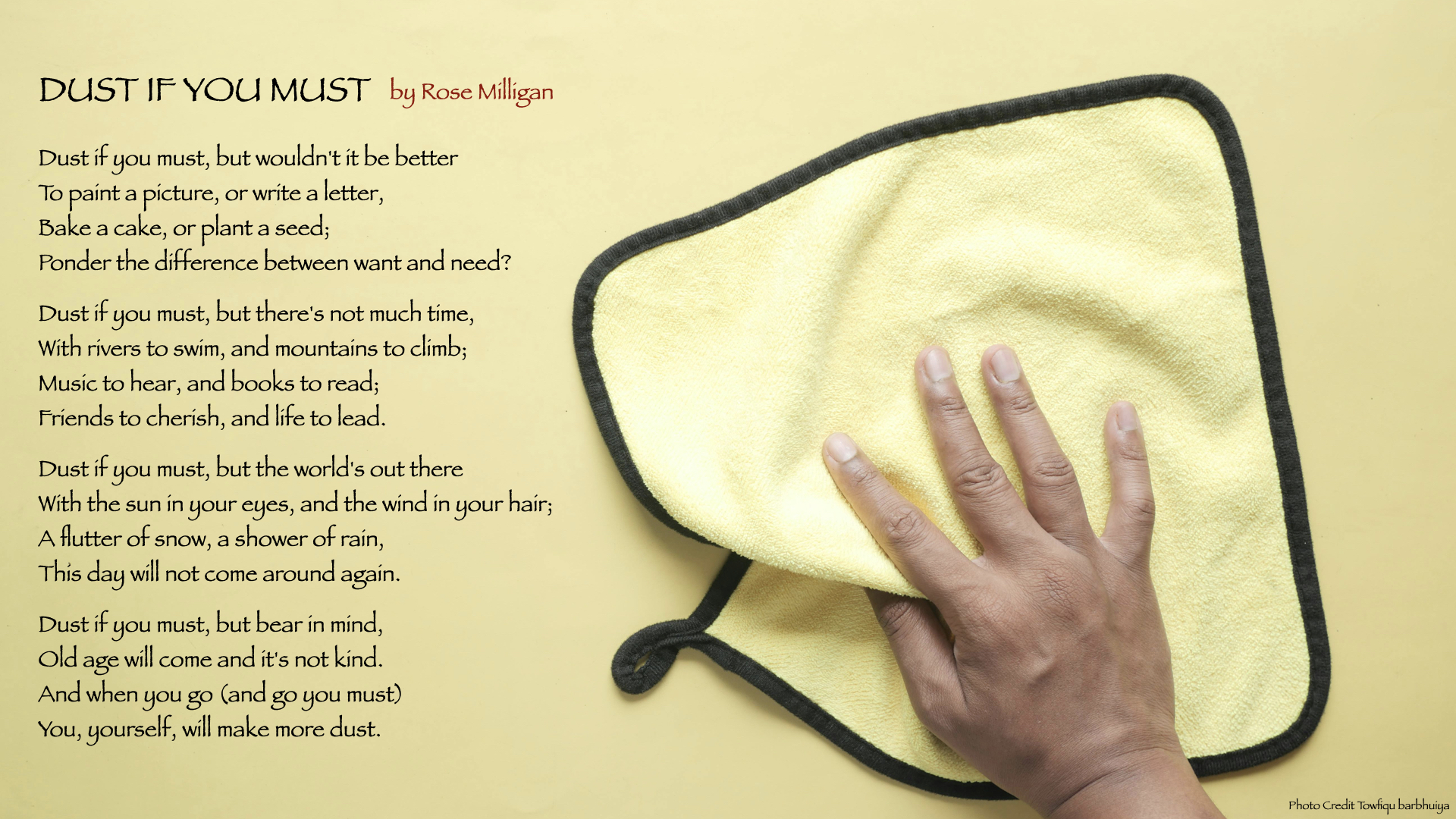 I did find a poem by Rose Milligan that made me smile. It’s called ‘Dust If You Must‘. I’d love to be able to convince myself that the explanation for my erratic and infrequent encounters with cleaning is that I’ve embraced the spirit of this poem. I’m fairly sure the real reason is my own lack of discipline.