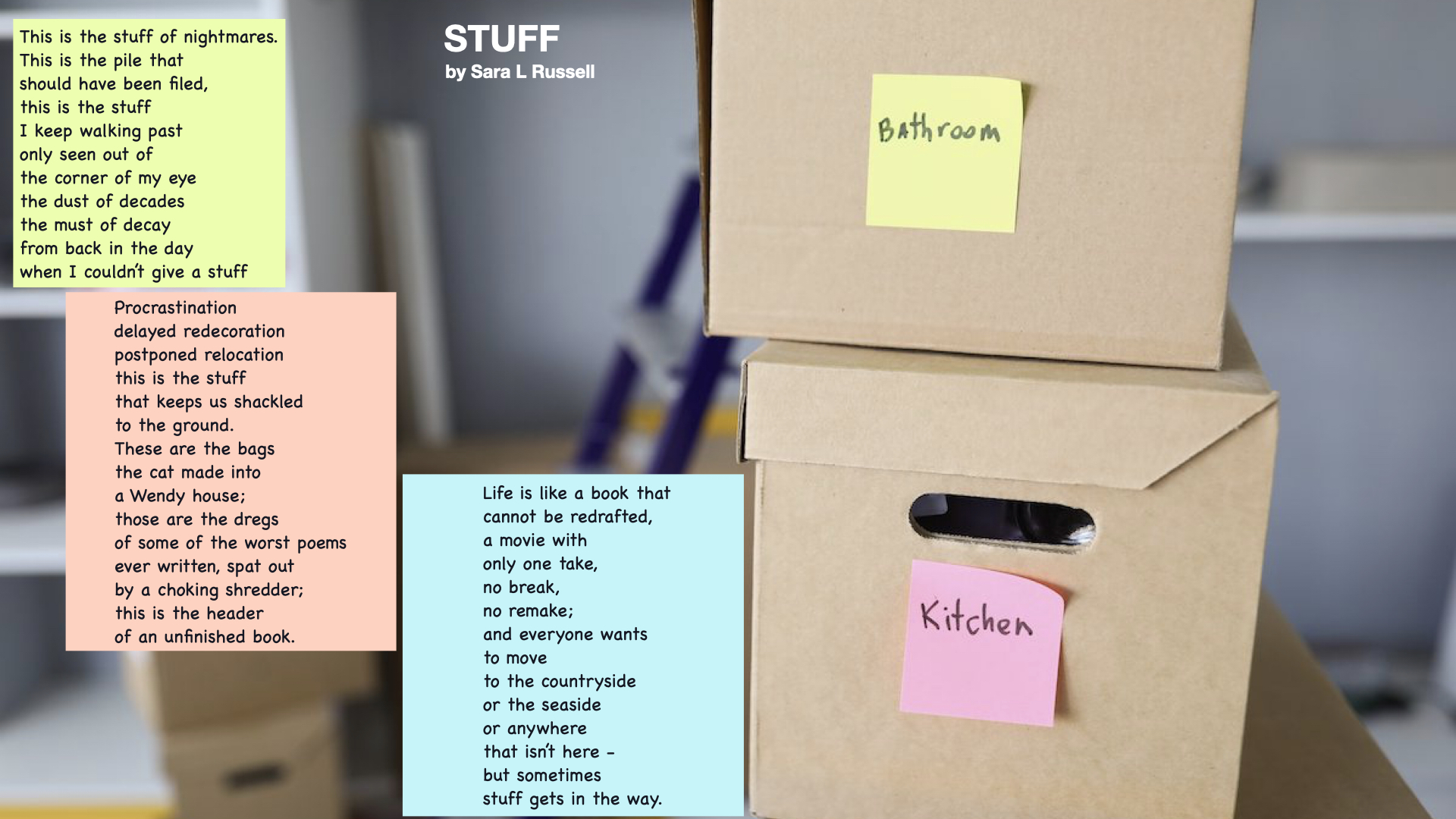 Anyway, I wondered if anyone else thought about stuff in this way, so I went looking for a poem. I found ‘Stuff’ by Sara L Russell. Now I know I’m not alone in not wanting to let stuff get in the way.
