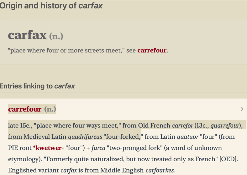 Harker’s etymology of Carfax caught my attention. In his notes on the house he says: