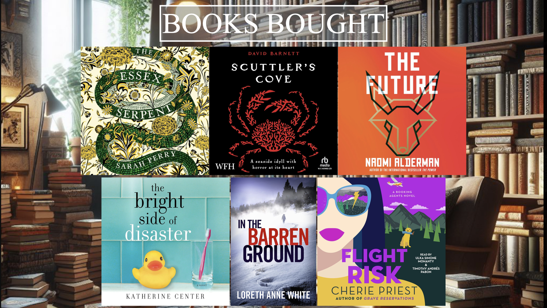 This week, I bought six books, twice as many as I read. I started to rationalise this by reminding myself that I got four of the books in Audible’s ‘two books for one credit’ sales. Then I decided I didn’t need to rationalise anything. I bought the books because they appealed to me and I’m looking forward to reading them one day. In the meantime, I’m just glad they’re there. They’re a mixed bag of books in terms of genre. Five of the six authors are new to me. Two of them are humorous. One is historical fiction, with claims to being Literature. One is an End Of The World As We Know It piece of speculative fiction. One is a Canadian crime novel and one is a just published horror novel. I’ve tagged the last three as books I might read for Halloween Bingo.